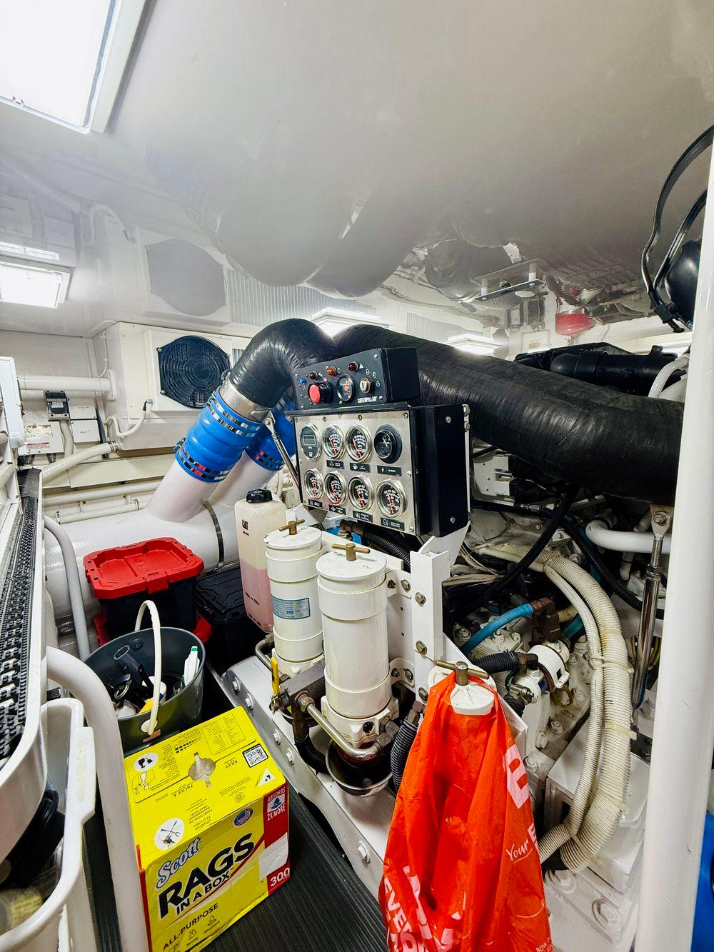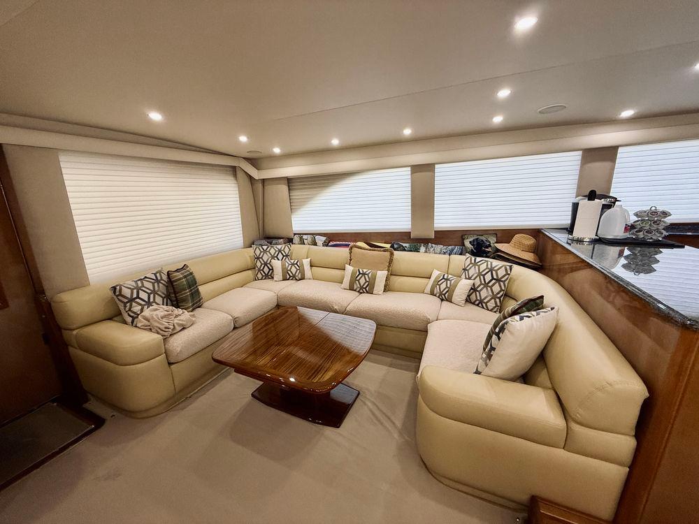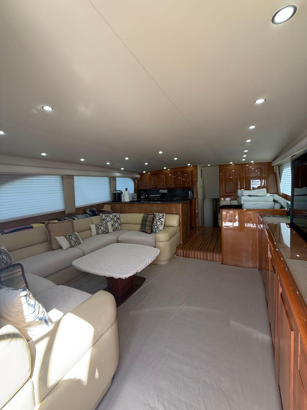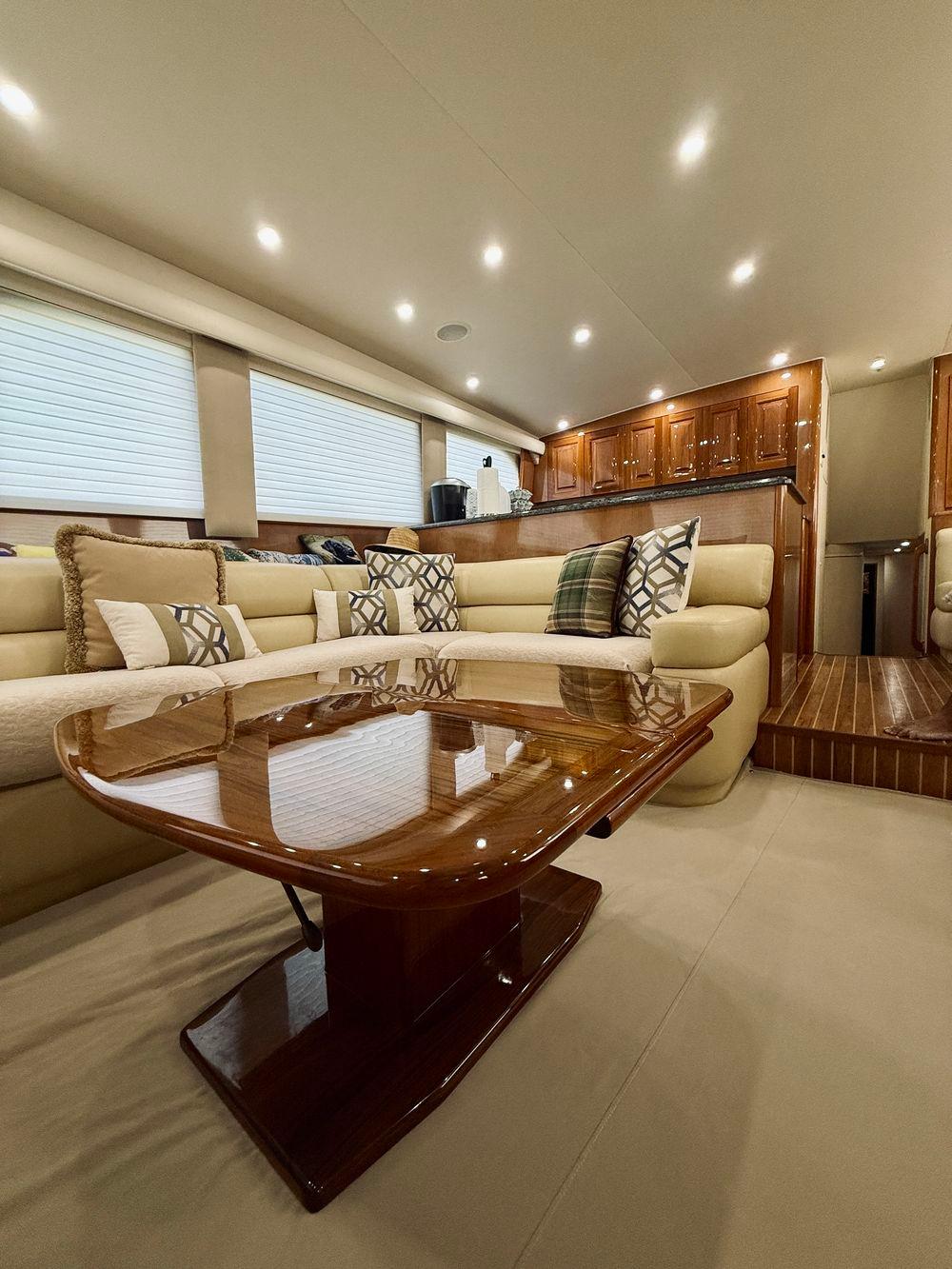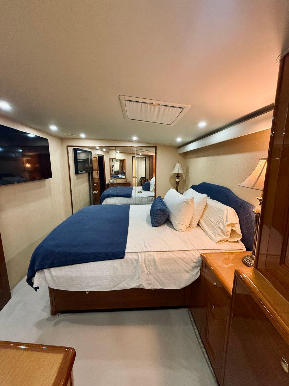 Stepping aboard she displays a 179 square foot cockpit that includes Mezzanine seating with easy engine room access, ample storage, plenty of refrigeration/freezer space. A beautiful fighting chair sits center for its next catch. There are glendenning cable master stations on both starboard and port sides of the cockpit. The teak decks and cover boards have been replaced and all the varnish on the boat is in excellent condition. A custom painted Whisper Gray ladder leads to the flybridge where you will find updated Garmin electronics, a new Makrolon enclosure, and upgraded refrigeration/freezer chest forward of the console.
