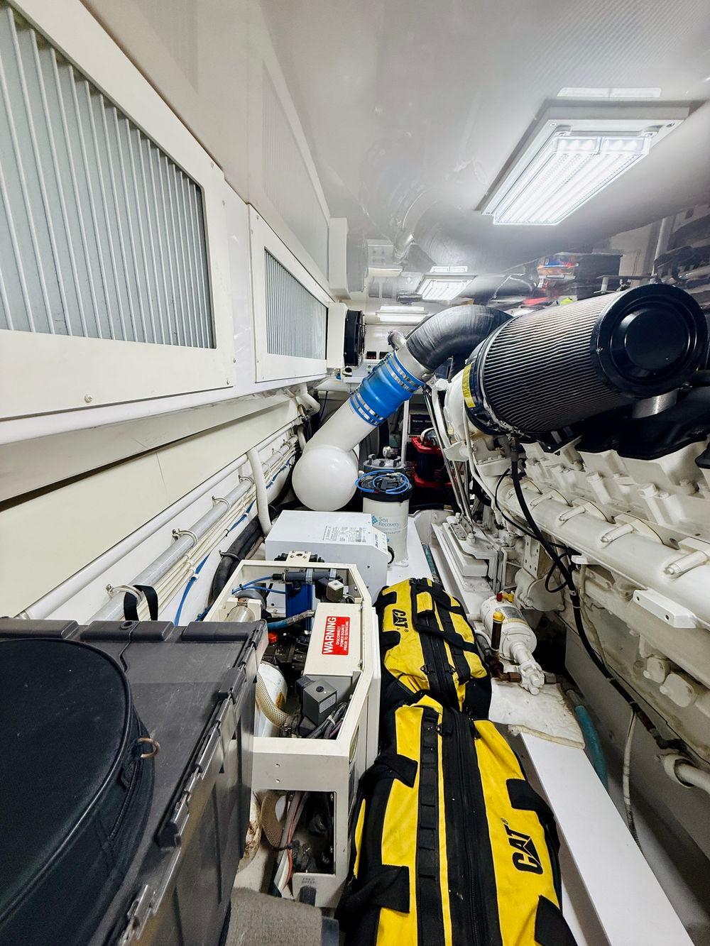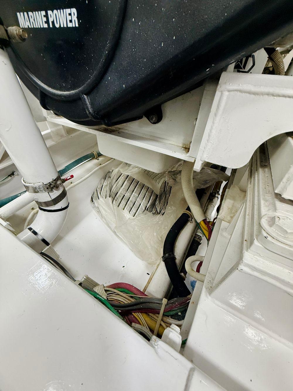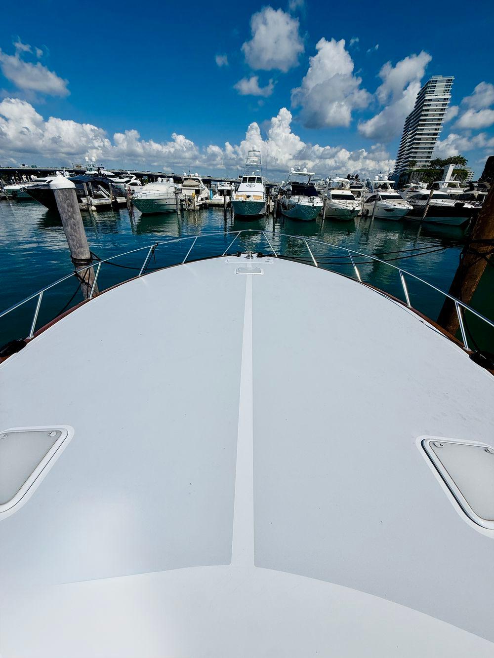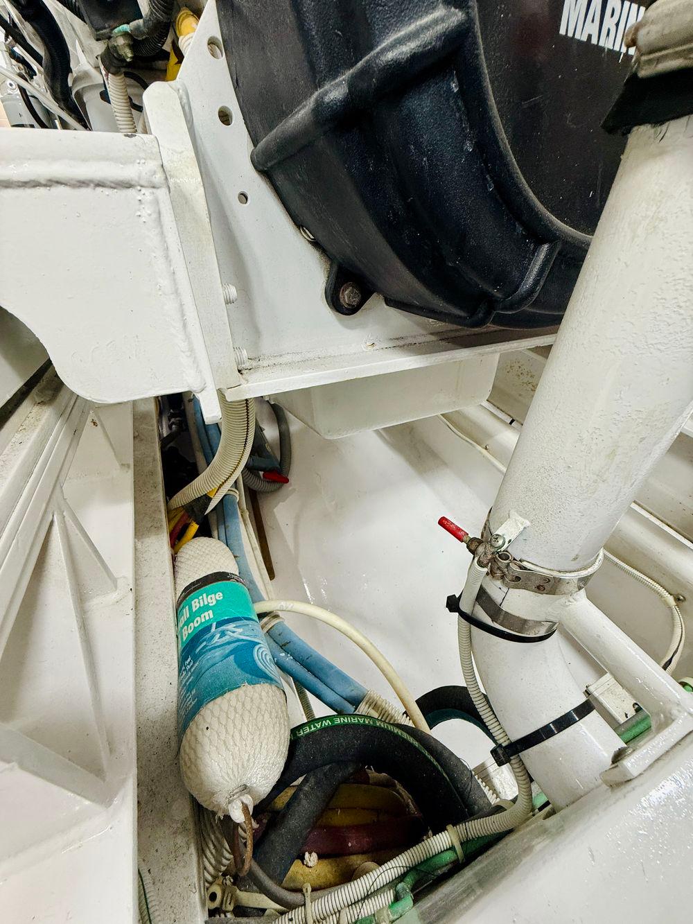 Stepping aboard she displays a 179 square foot cockpit that includes Mezzanine seating with easy engine room access, ample storage, plenty of refrigeration/freezer space. A beautiful fighting chair sits center for its next catch. There are glendenning cable master stations on both starboard and port sides of the cockpit. The teak decks and cover boards have been replaced and all the varnish on the boat is in excellent condition. A custom painted Whisper Gray ladder leads to the flybridge where you will find updated Garmin electronics, a new Makrolon enclosure, and upgraded refrigeration/freezer chest forward of the console.