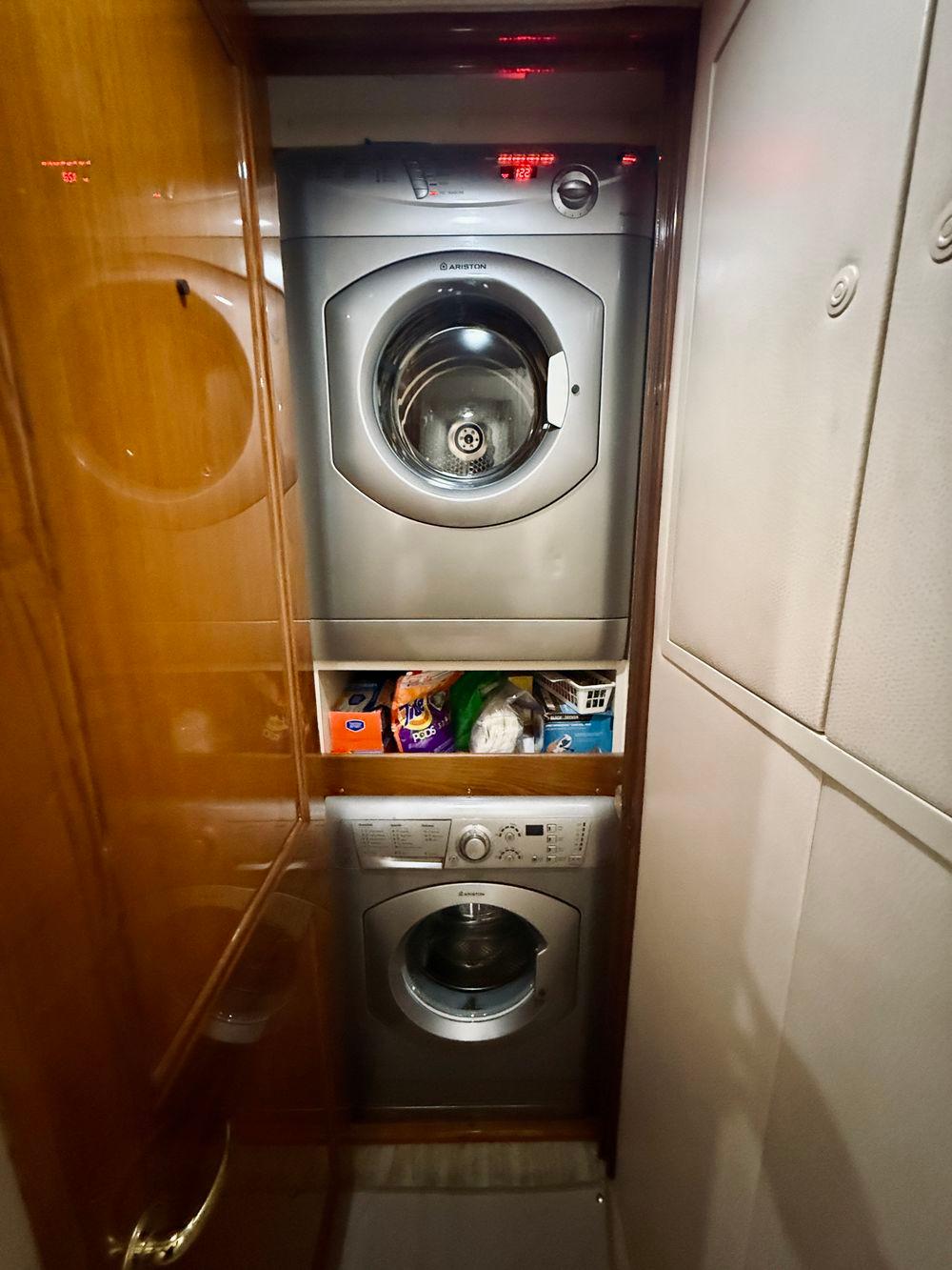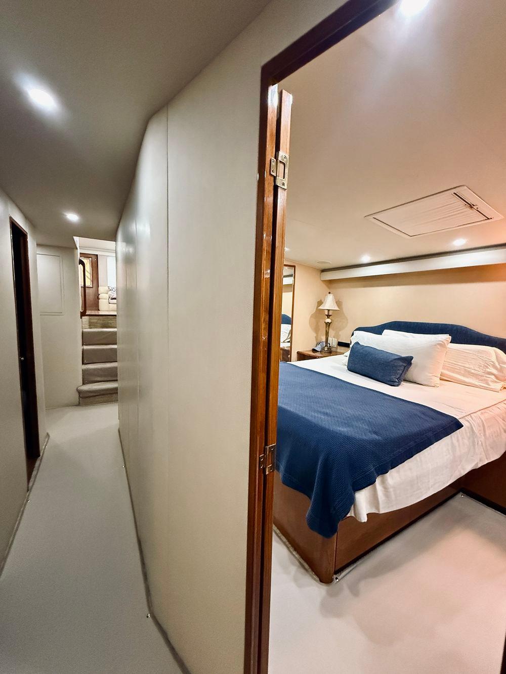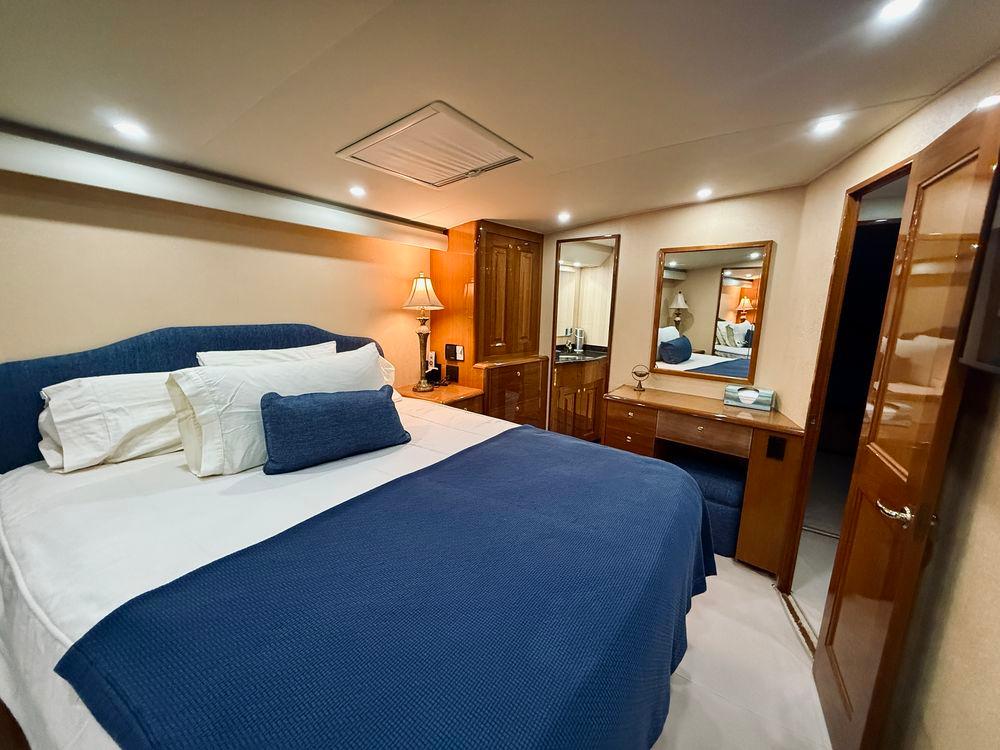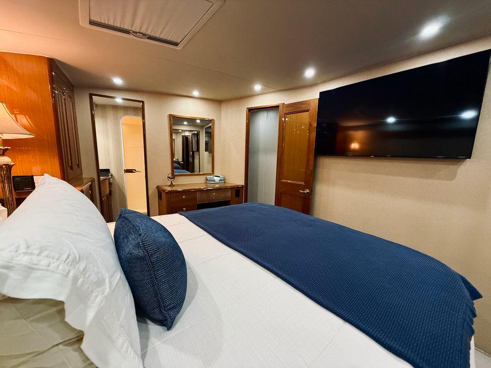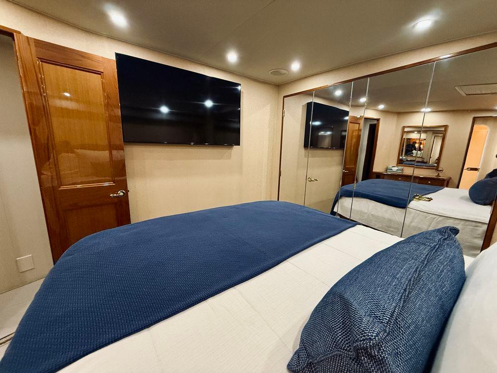 Below deck, the master suite with a walk around king size bed is amidship and the forward VIP stateroom has a centerline queen birth. A guest cabin on the starboard side has upper/lower berths, and the fourth stateroom, opposite of the companionway stackable washer and dryer, is abaft the master suite. It has a separate head and shower with direct engine room access, making this stateroom ideal for both guests or crew.