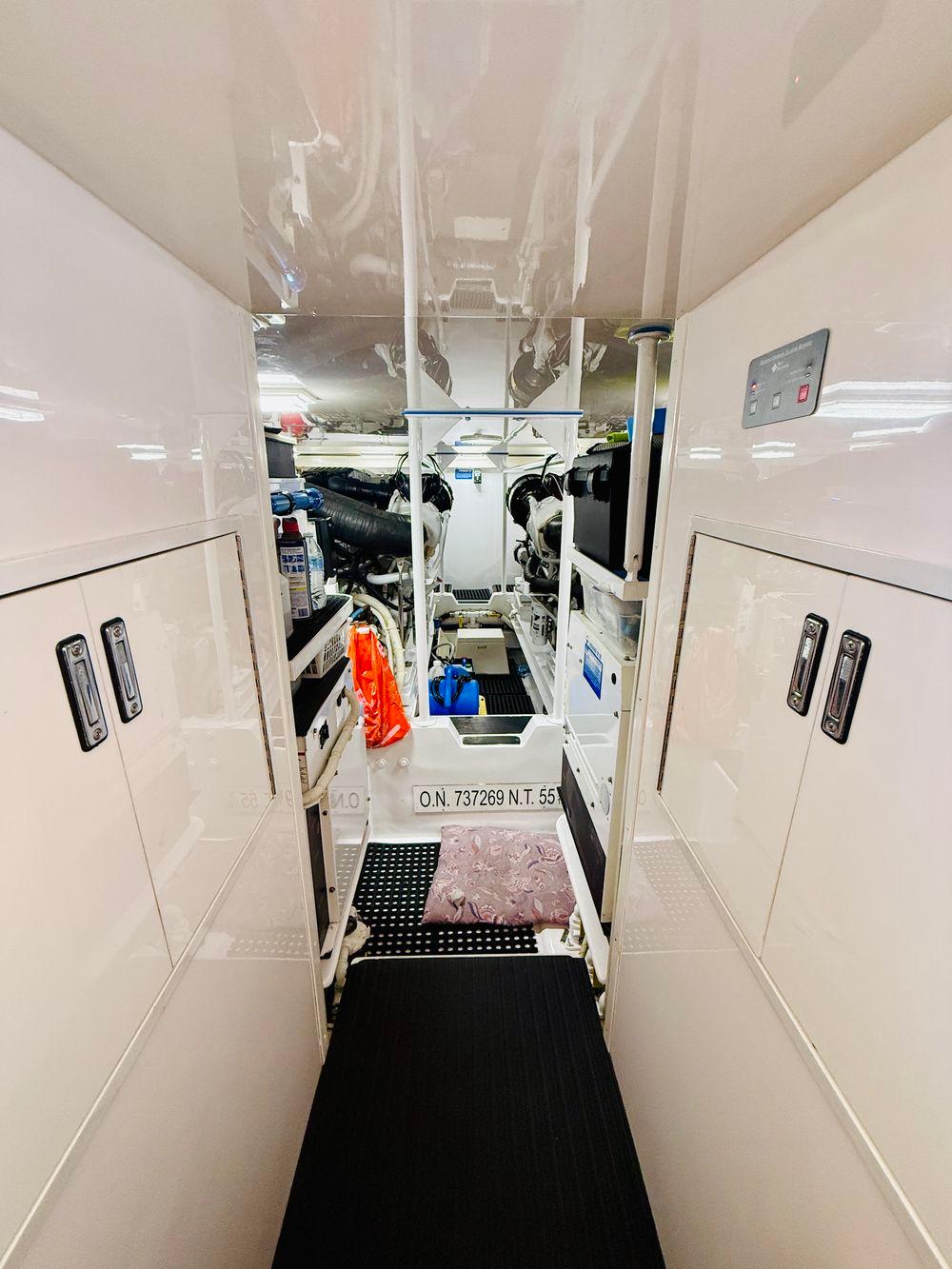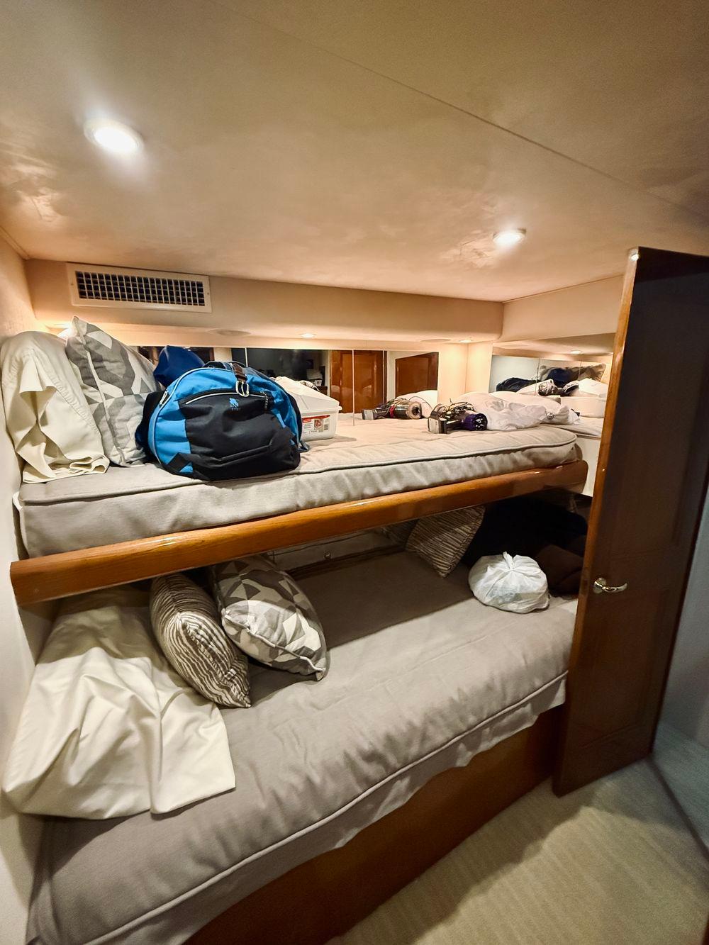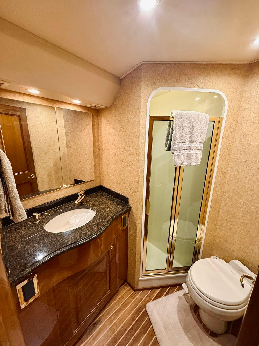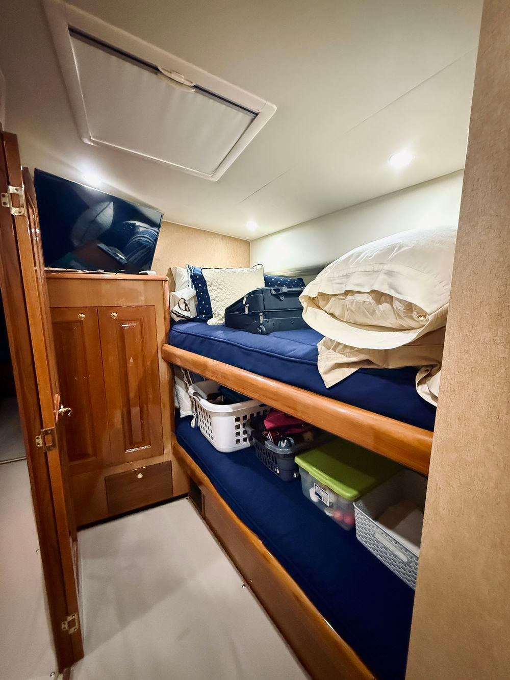 Below deck, the master suite with a walk around king size bed is amidship and the forward VIP stateroom has a centerline queen birth. A guest cabin on the starboard side has upper/lower berths, and the fourth stateroom, opposite of the companionway stackable washer and dryer, is abaft the master suite. It has a separate head and shower with direct engine room access, making this stateroom ideal for both guests or crew.