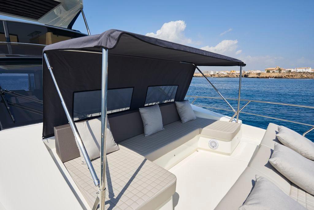 The bow deck has a spacious sun pad, just forward of the Portuguese bridge lounge with a table, covered by a retractable Bimini top.