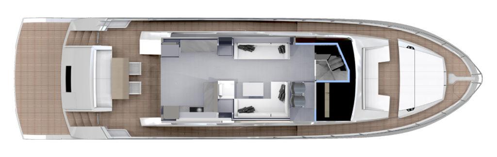 The flybridge has been designed to fit any lifestyle; it features a covered helm with a retractable sunroof and an outdoor galley that is joined to an open aft section that can host your yachting dreams.