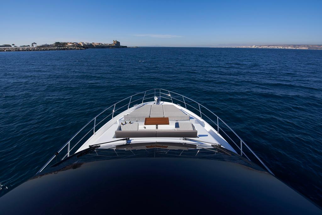 The bow deck has a spacious sun pad, just forward of the Portuguese bridge lounge with a table, covered by a retractable Bimini top.