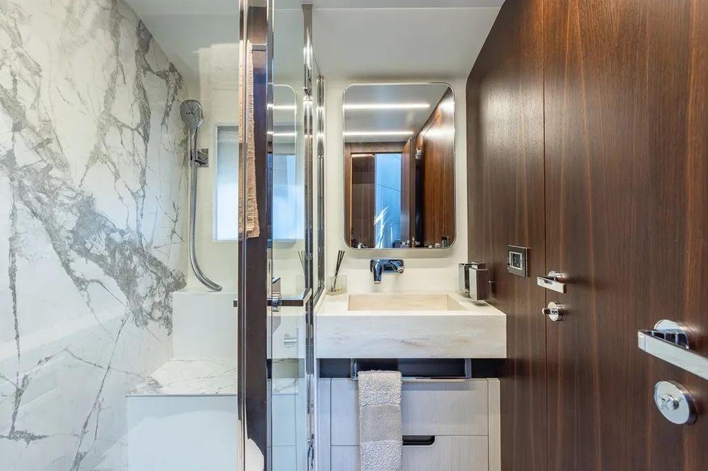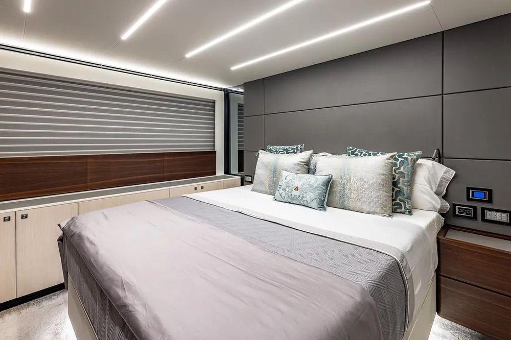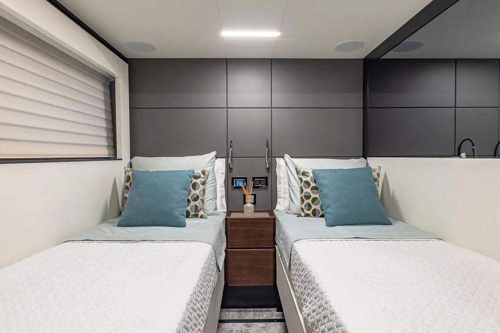 - Galley appliances (fridge/freezer, extra fridge port side, oven/microwave, ceramic stovetop)