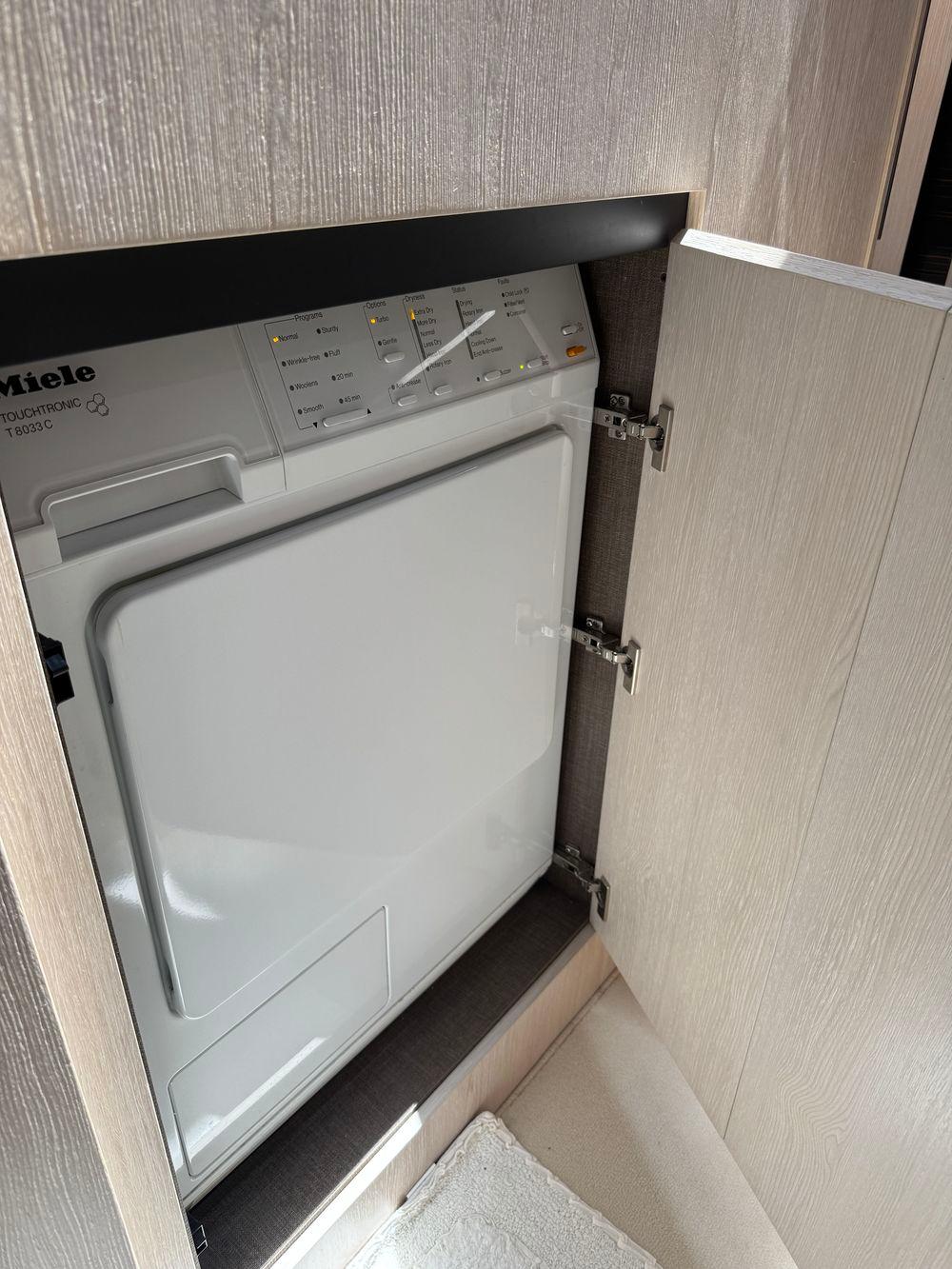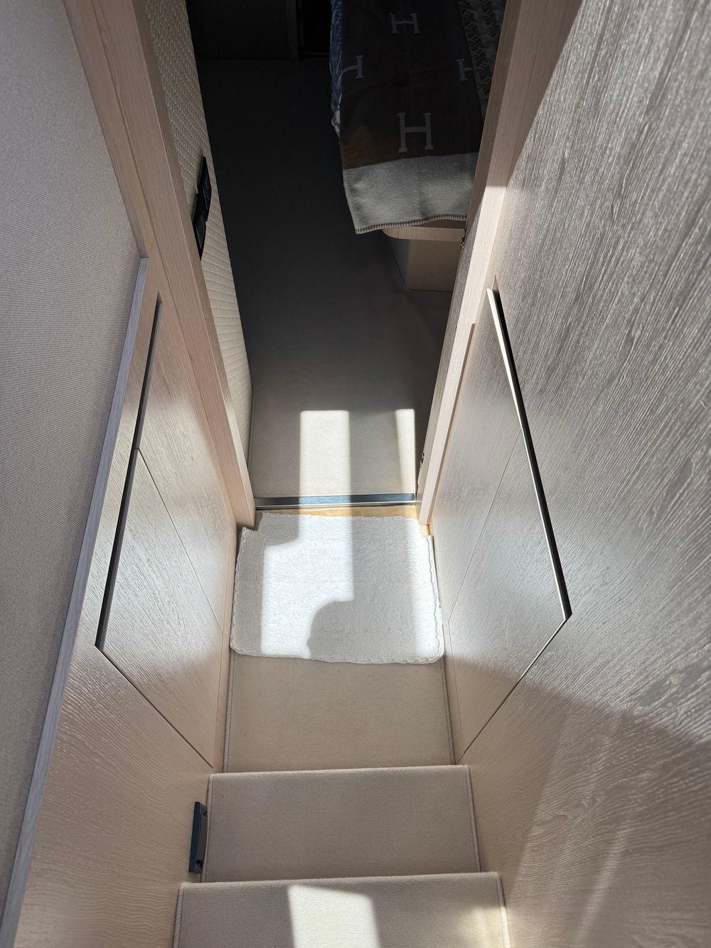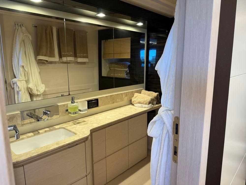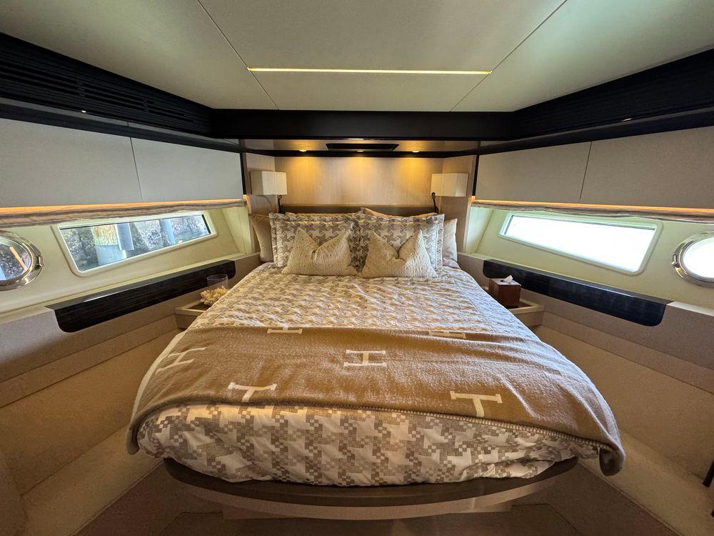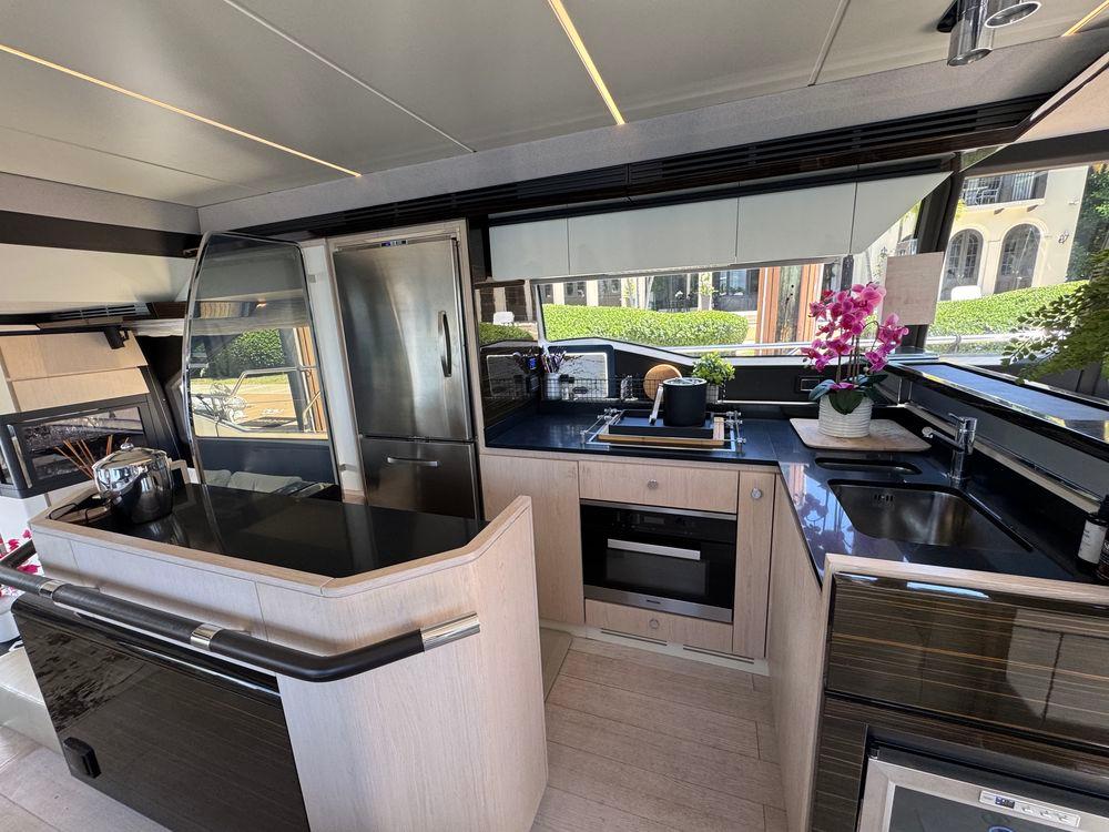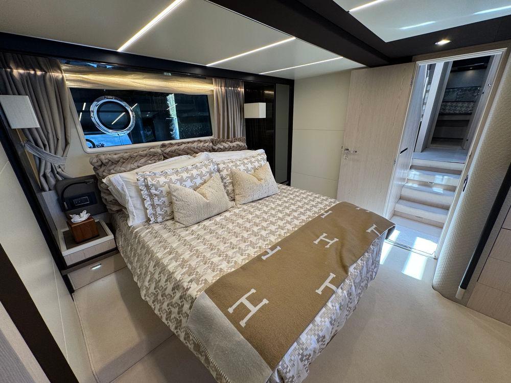 Step aboard and you’ll immediately notice the massive flybridge—one of the largest in its class—offering plenty of space to enjoy the sun, dine with friends, or simply take in the view. Inside, the salon is bright and airy, with oversized windows and elegant finishes that make it feel like a floating luxury apartment. The open-plan layout flows effortlessly from the galley to the lounge and dining areas.