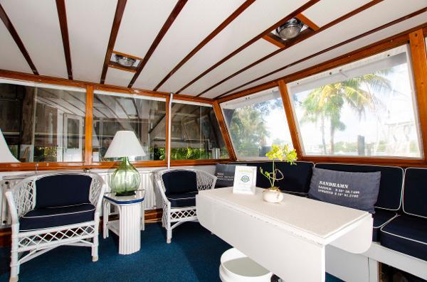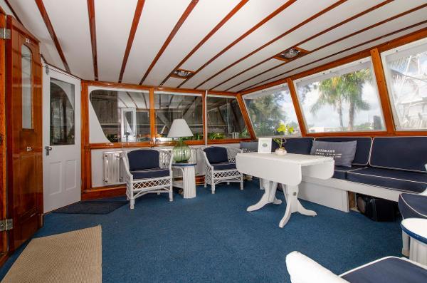 Walking along the graceful profile of LIBERTY to the boarding ladder located just aft of midship, one cannot help but be impressed. Her clean, clutter free, decks are perfectly suited for lounging in a teak deck chair with a cold beverage in hand. The two dunnage boxes are covered to protect them from the Florida sun. Proceeding through either wing door to port and starboard, one finds a most accommodating aft deck that can be enclosed or open with sliding plexiglass windows and roll-up isinglass curtains. There is a built in settee fully aft, a very handy Hi-Lo table and 4 white Bamboo chairs that make gathering guests together for cocktails or dinner extremely easy and enjoyable.