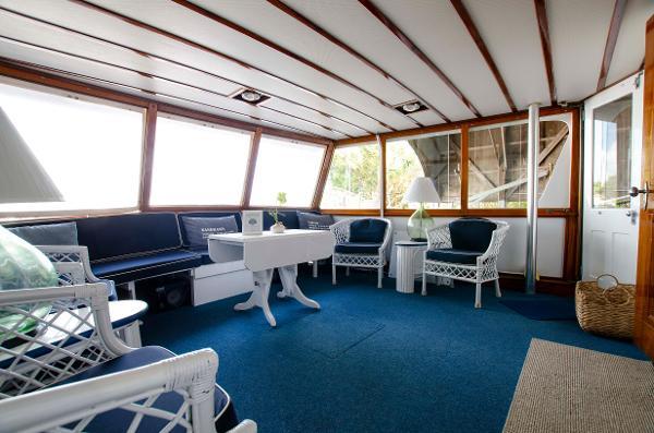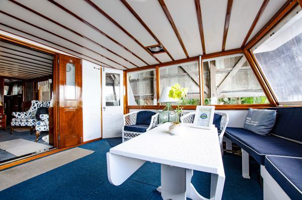 The aft deck has been refurbished to reflect a bygone era with nautical blue indoor/outdoor carpet, white bamboo side table, lamps as well as navy blue cushions for the settee and the chairs. All over head lights are LED and provide perfect illumination for reading, dancing, or chit chatting.