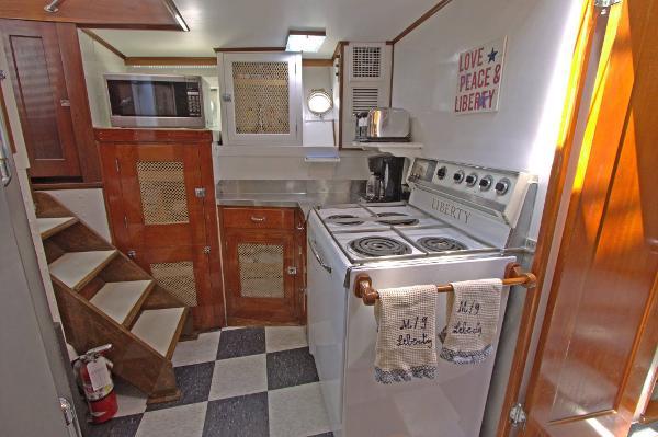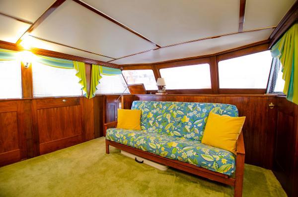 The overhead is newly painted white with the traditional varnished teak battens. Here too, the lighting has been upgraded to LED. If you turn and look at the aft doors, you will see beautiful glass uppers and removable bottom panels that allow the fresh breeze to circulate. To ensure even more cross breezes, one may crank down the two large windows located to port and starboard.These too have been lovingly refitted and brought back to original. White shades and valances insure privacy while dockside.
