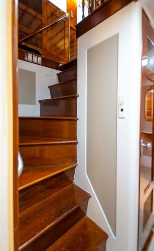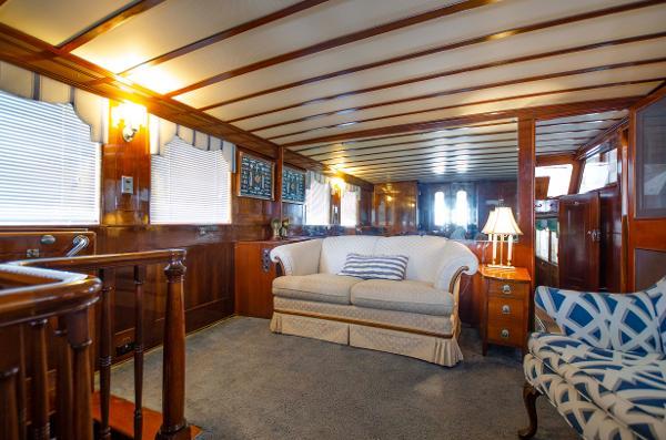 Your breath is taken away by the warmth and glow emanating from the original mahogany paneling. The paneling and the original built in signature Trumpy secretary on the aft starboard bulkhead were painstakingly stripped and refinished.