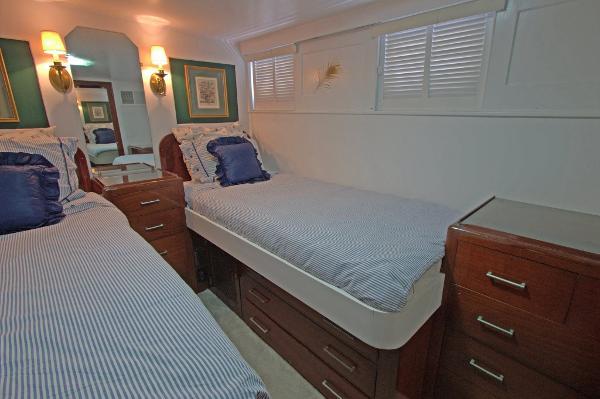 Blue and white upholstered wing chairs, so reminiscent of a luxury rarely encountered in modern day yachts have a small table and lamp between them. A suitably upholstered love seat is located forward. There is a large mirror above sofa running athwart ship across the forward bulkhead. Next to the love seat is a lovely, small mahogany cabinet with storage and a lamp a handsome reading lamp. A built in cabinet on the far end of the love seat houses an air cooled portable AC unit.