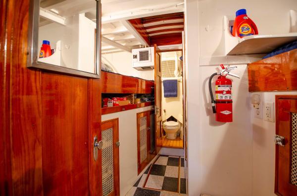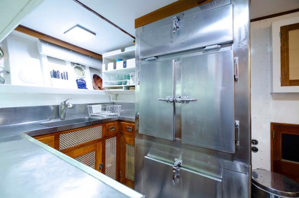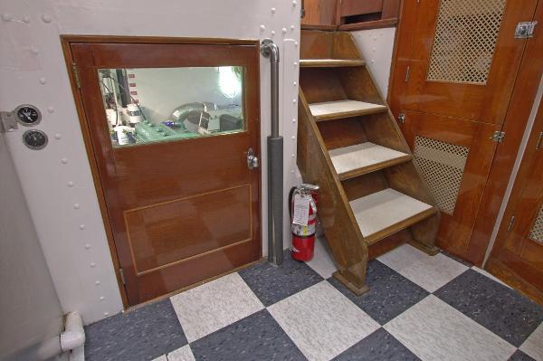 A doorway on the port side of LIBERTY'S leads aft from the galley into the immaculate engine room. It is very apparent that the bulk of the 1.3 million dollars spent to bring LIBERTY back to her former glory, was spent in the ER.