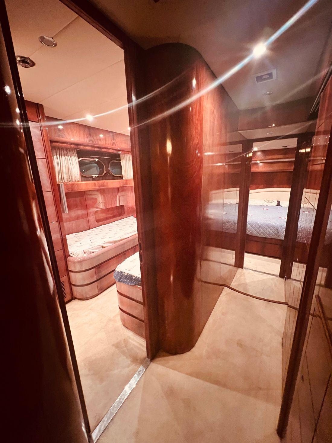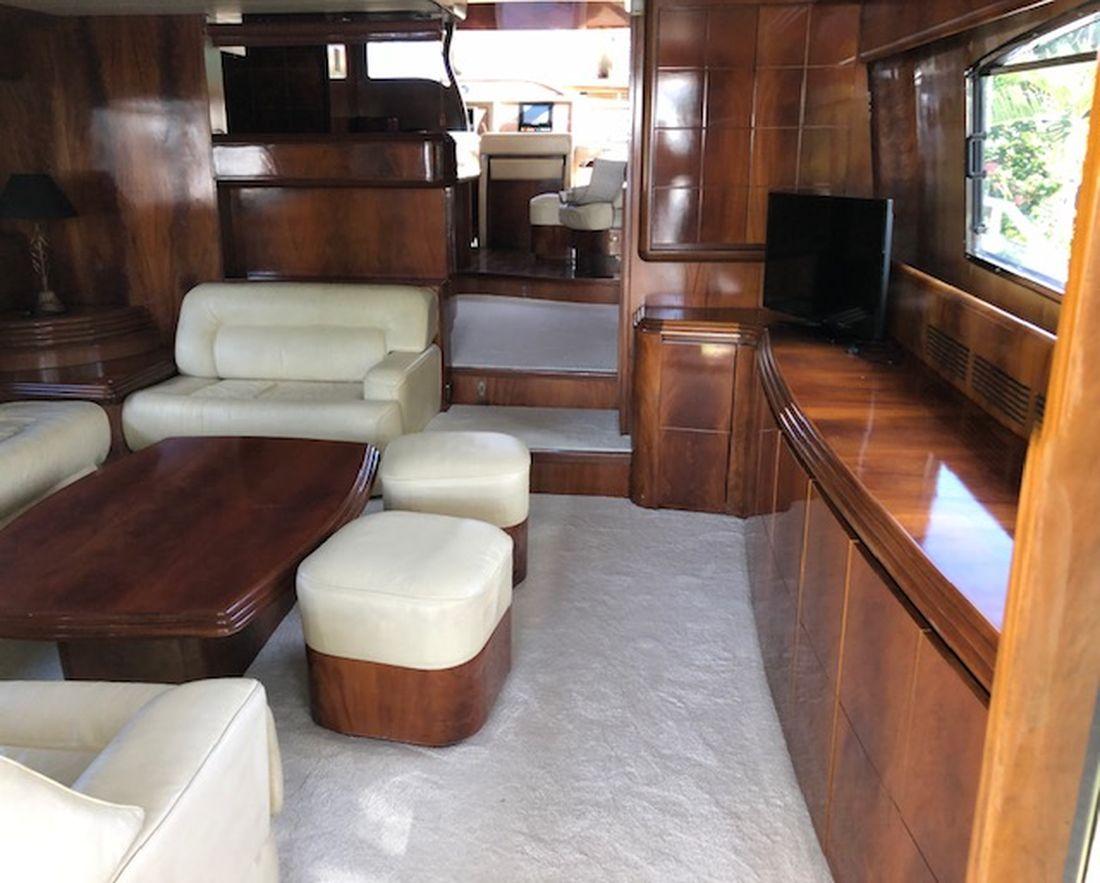 The main deck interior is made up of the saloon and galley with the main wheelhouse located forward, a covered aft deck with hydraulic bathing platform and large foredeck for sunbathing and mooring.
