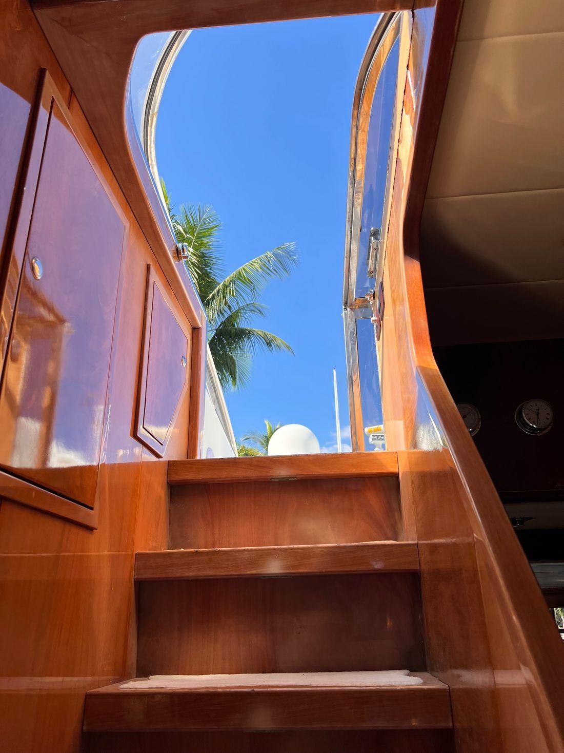 The lower deck is accessed by an illuminated staircase from the main helm.