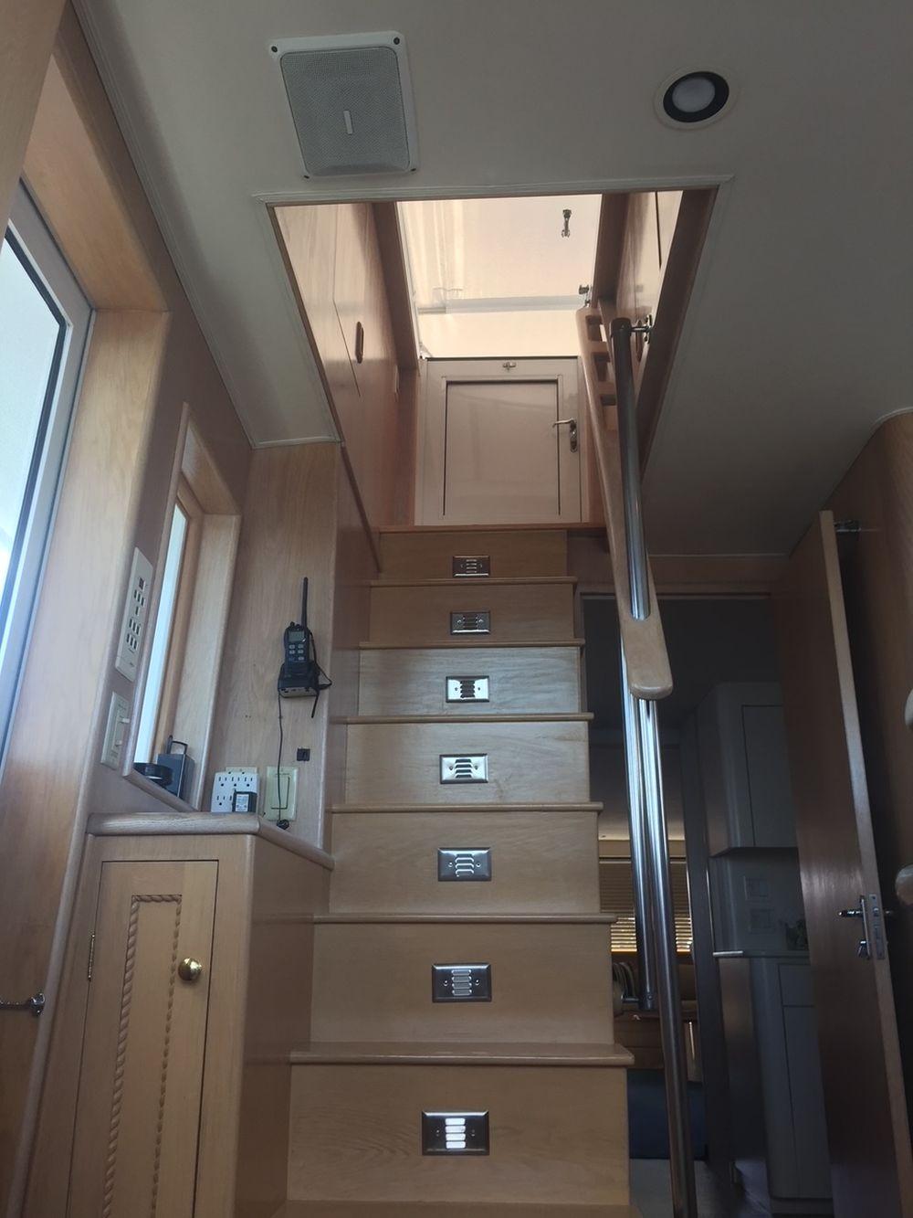 A staircase leads from the pilothouse to the flybridge.