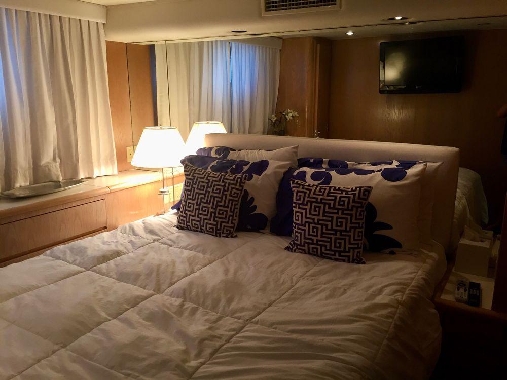 The full-beam master stateroom boasts a luxurious centerline king-size berth with an upholstered headboard, complemented by a custom-painted scene depicting a window opening to the sea. Behind the berth, you'll find a bespoke his-and-her head featuring private areas separated by a custom walk-through shower.