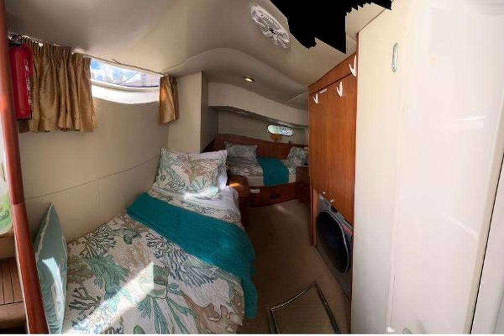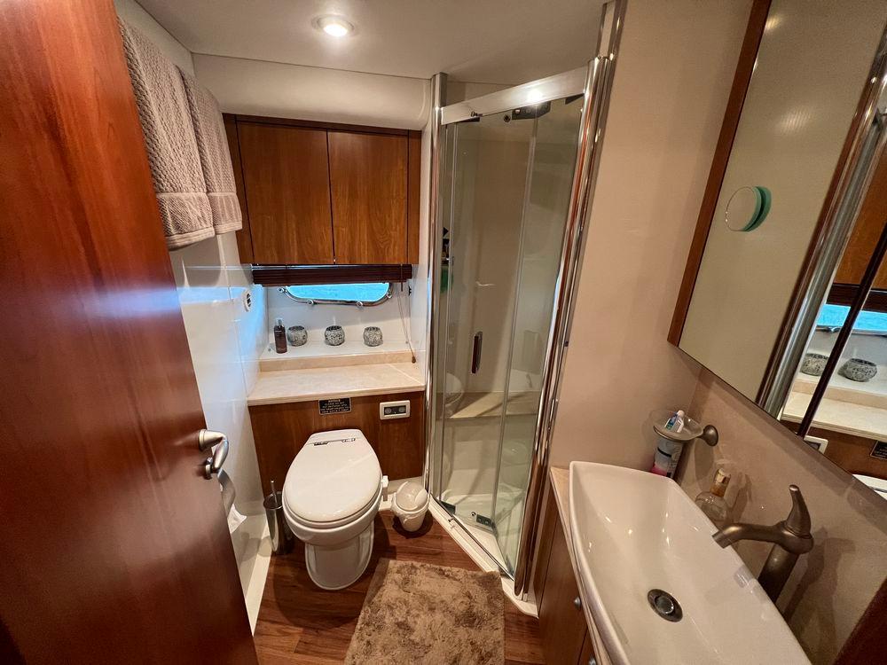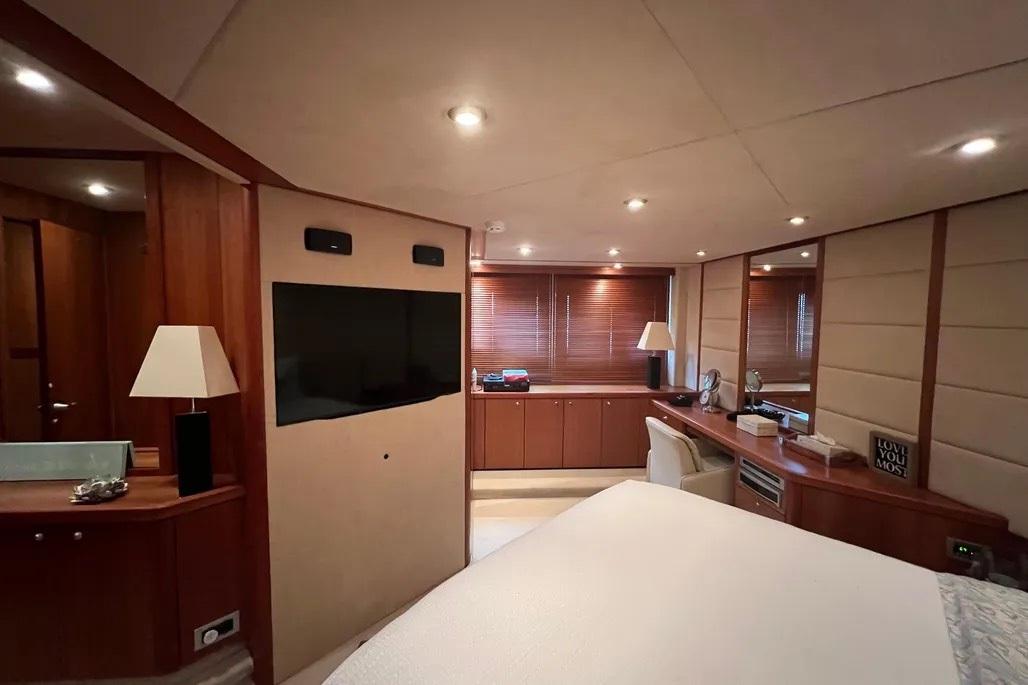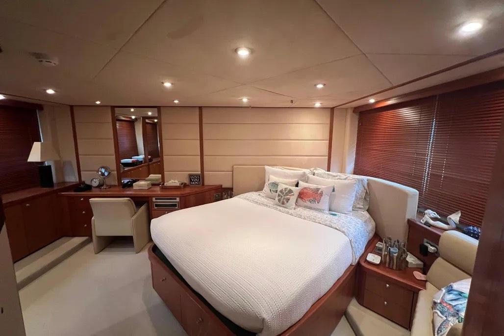 Enter the interior through full width sliding companionway doors to the full panoramic view salon. Forward is the dinette to port and fully equipped galley to starboard. Forward is the helm station to starboard with full arrays of engine monitoring gauges and electronic navigation equipment. Forward and down are the guest staterooms with ensuite head/showers. Master stateroom and ensuite head/shower is aft. Indirect and courtesy lighting throughout the interior and exterior. Vessel is air conditioned through-out. She also has DirecTV satellite in all staterooms, DVR in the salon & master with KVH at Sea dish antenna system.