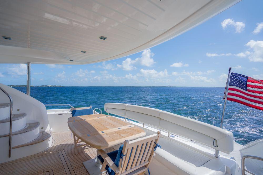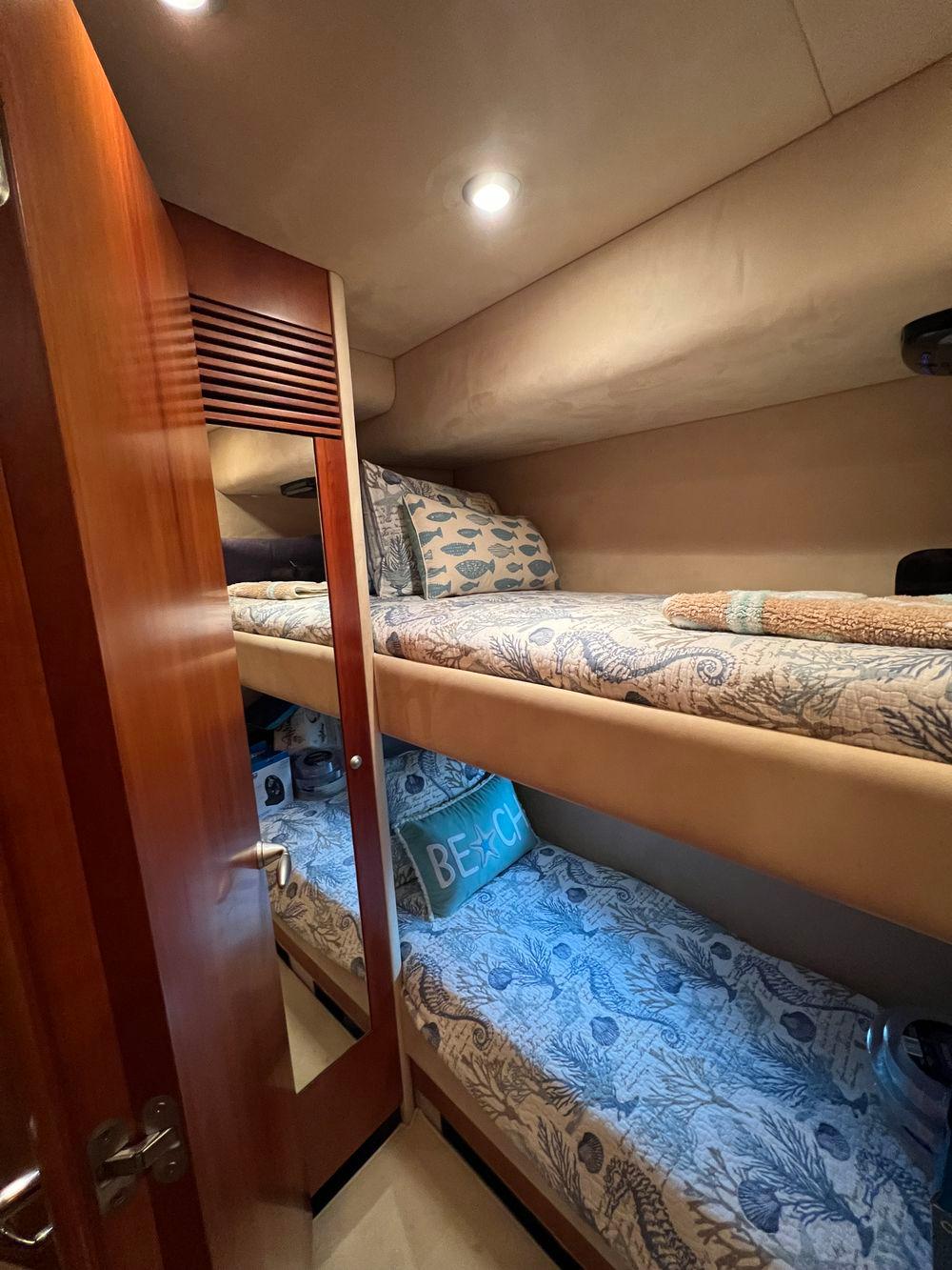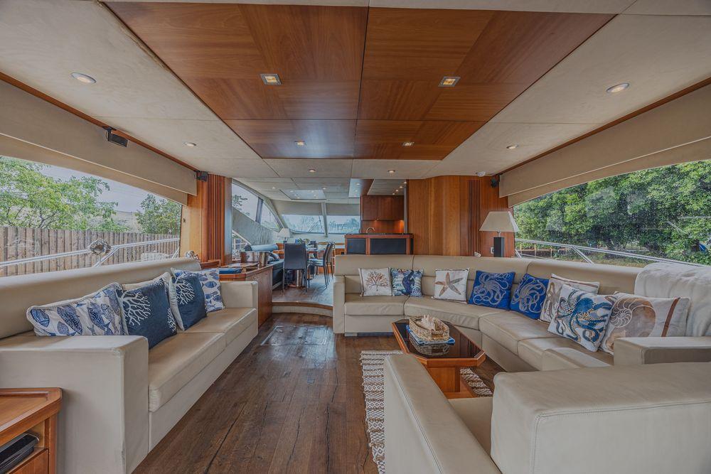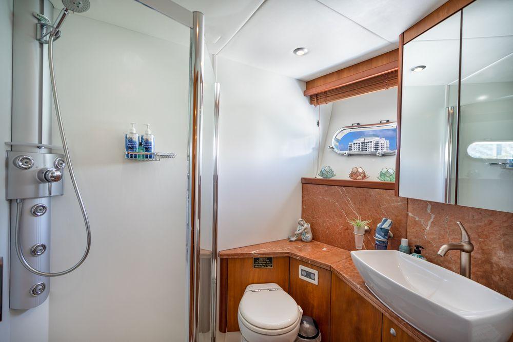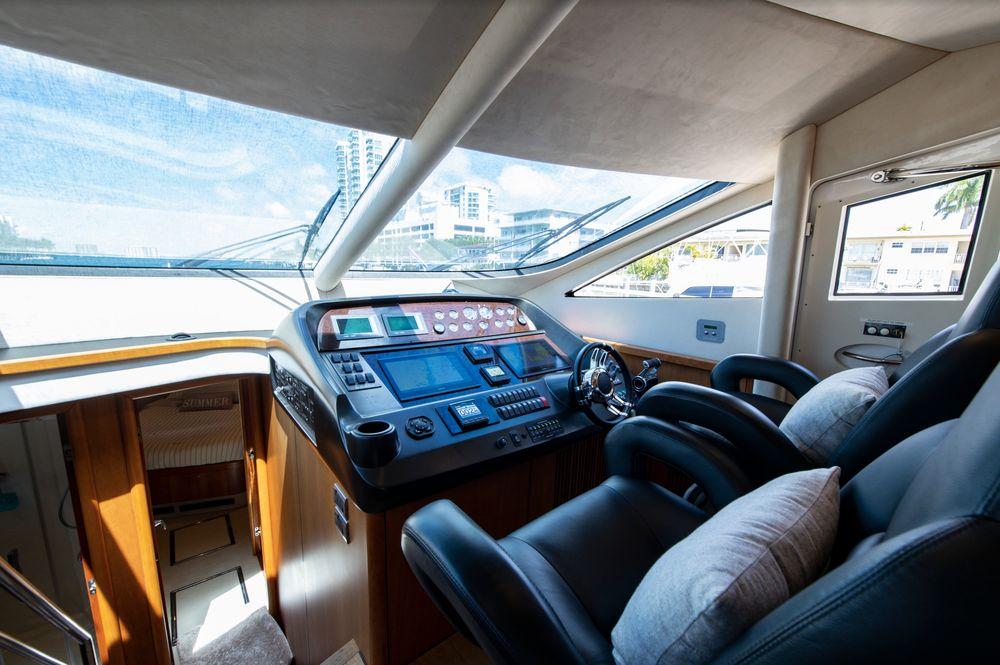 Enter the interior through full width sliding companionway doors to the full panoramic view salon. Forward is the dinette to port and fully equipped galley to starboard. Forward is the helm station to starboard with full arrays of engine monitoring gauges and electronic navigation equipment. Forward and down are the guest staterooms with ensuite head/showers. Master stateroom and ensuite head/shower is aft. Indirect and courtesy lighting throughout the interior and exterior. Vessel is air conditioned through-out. She also has DirecTV satellite in all staterooms, DVR in the salon & master with KVH at Sea dish antenna system.
