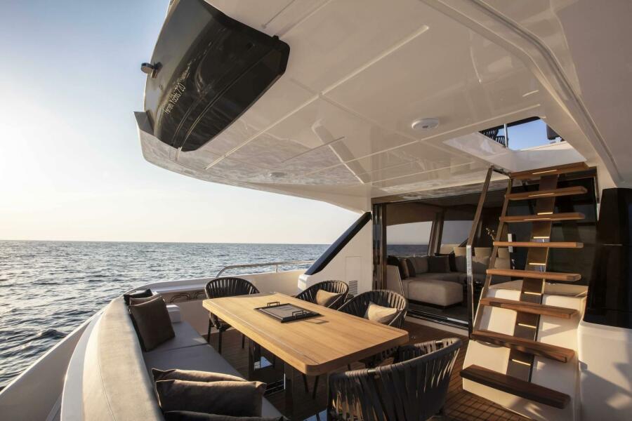 The Ferretti Yachts 720 debuted at the 2019 Cannes Yachting Festival and caused an immediate stir. With her amazing spaces, unexpected headroom and abundance of areas to enjoy, she takes the cruising experience to a new level. She is the fruit of a partnership between our Product Strategy Committee and the Engineering department – the second yacht with external design by Salvetti and Ferretti Group, with interiors by our own architects and designers. The spacious master cabin echoes the play of colors and materials that grace the main deck, in a peerless private setting that’s a joy to discover.