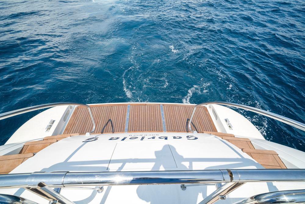 - When entering the boat from the dock or by water, the near full-beam teak swim platform has plenty of room for guests' boarding. Two sets of stairs surround the large garage, which opens like a clam shell, revealing space for a large tender and water toys. The Besenzoni passerelle is mounted in the top of the garage and can be used as a davit, or as a walkway extending out of its own door when the garage is closed. Additionally, there are chocks for a PWC, which mount on the swim platform just aft of the garage door. Centerline, a retractible swim ladder extends out for easy boarding from the water.