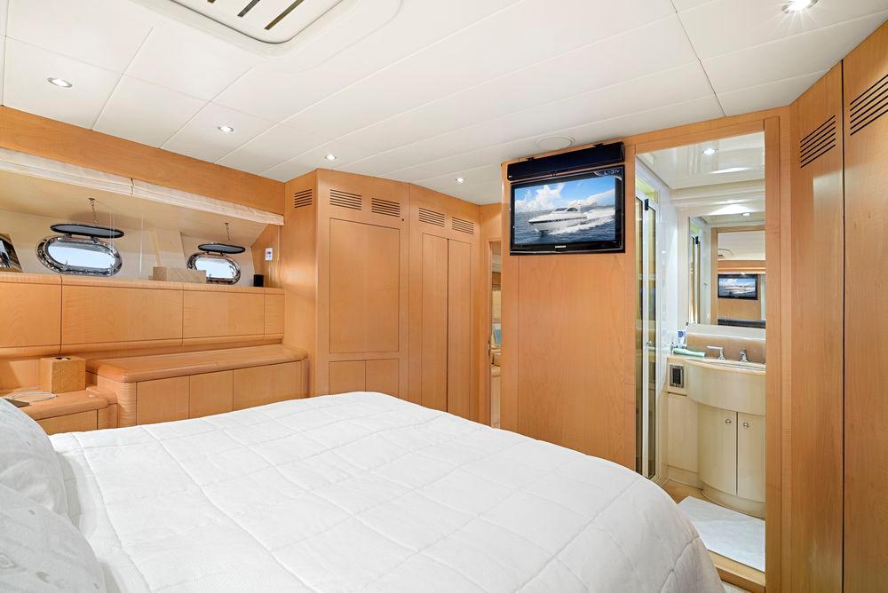 - The full beam master stateroom is forward of the lounge with its queen sized island berth accessible from either side. Twin lockers and cabinetry provide adequate storage space and the port side settee allows a nice, private place to sit. A new TV and sound system are mounted aft. The private en-suite bath has a full standup shower, head, and onyx countertops.