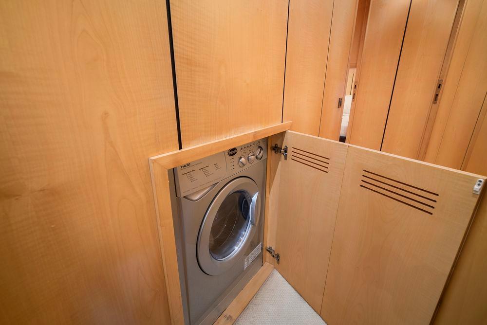 - Aft of the lounge, in the companionway to the identical twin staterooms, a locker contains the new washer/dryer combo and provides ample storage for dish wares, linens, and other accessories.