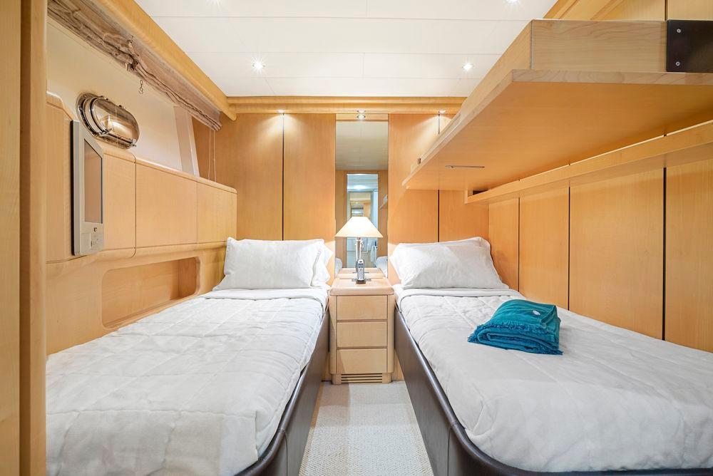 - Both guest staterooms are aft and identical featuring twin bunks, a pullman 3rd twin bunk. Each offers an ensuite head with standup shower and onyx countertops. In total, 8 guests may sleep comfortably aboard this Mangusta.