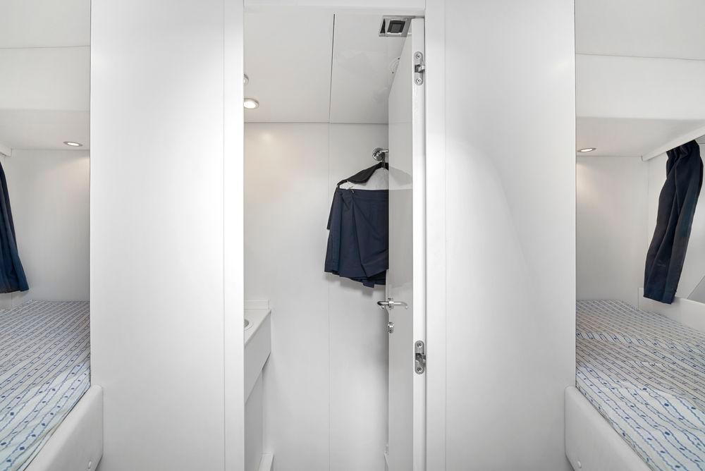 - Forward is a hatch leading into the separate crew quarters. In great conditions, this area provides two bunks, an ensuite head and shower, and self-contained air-conditioning. Included in the sale price of the yacht is dedicated bedding for the bunks as well as crew uniforms.