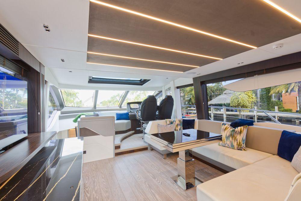 2022 74' Sunseeker Sport Yacht - a modern 74’ Sunseeker Sport Yacht featuring the very best upgraded V-New 12 cylinder 1900 HP Common Rail MAN Diesels. This 74’ Sunseeker was customized with a warm and inviting interior featuring carbon fiber detailing with the sleek styling of an express and the functionality of a bridge yacht.