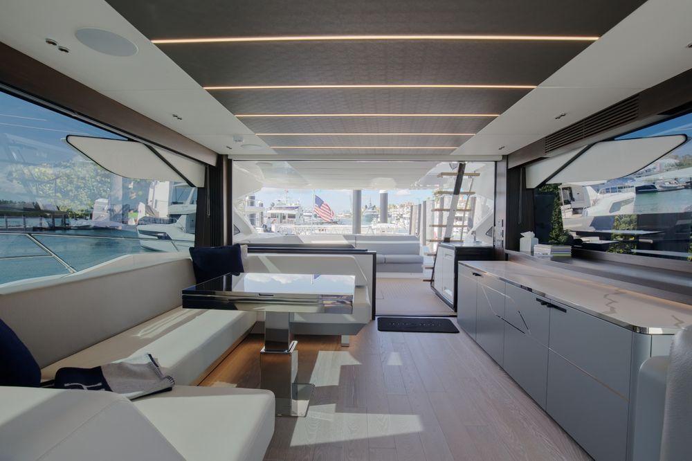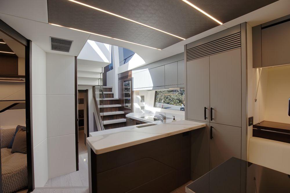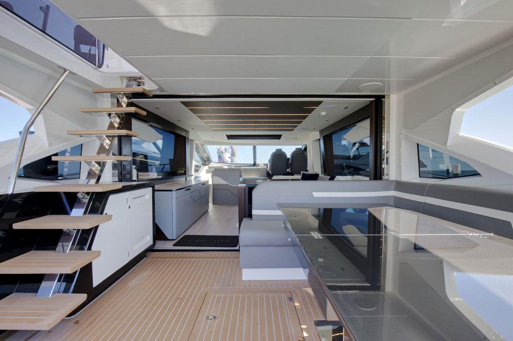 Inside, the yacht's elegance continues with exquisite woods, contrasting fabrics, and bold features like carbon fiber trims. The main deck features a well-lit seating area, a fold-out table, and a fully-equipped helm station. Below deck, spacious accommodations for eight guests and two crew members include a full-beam master cabin and en-suite guest suites. The lower galley and dining space create a social hub for intimate gatherings. The 74 Sport Yacht promises an exceptional owner experience, blending luxury with powerful sea-keeping capabilities.
