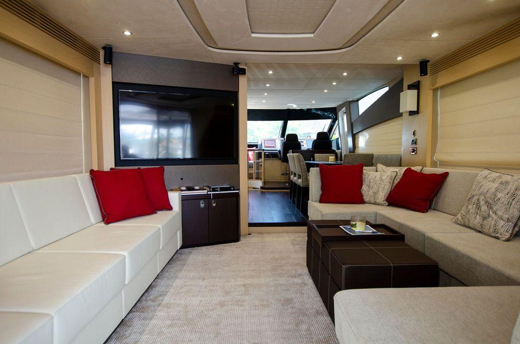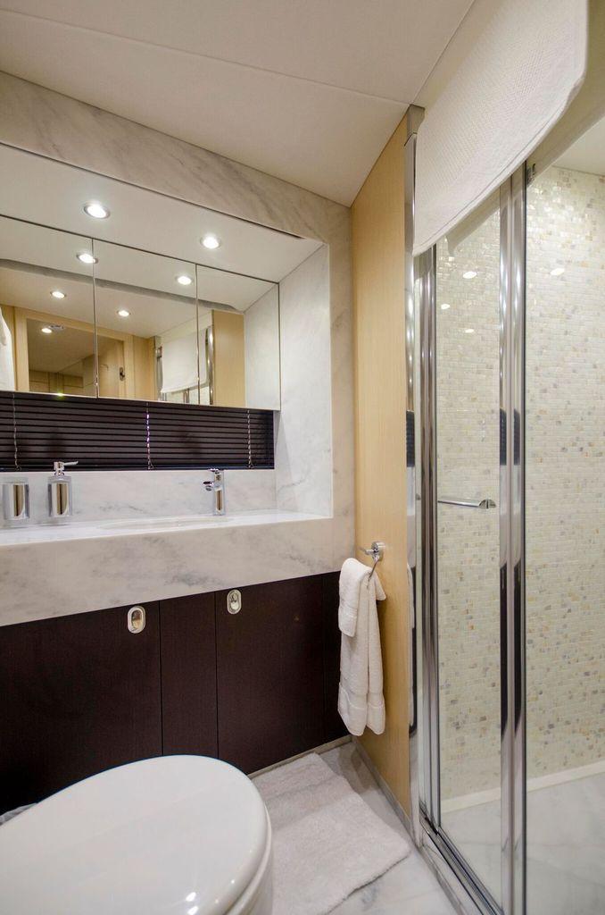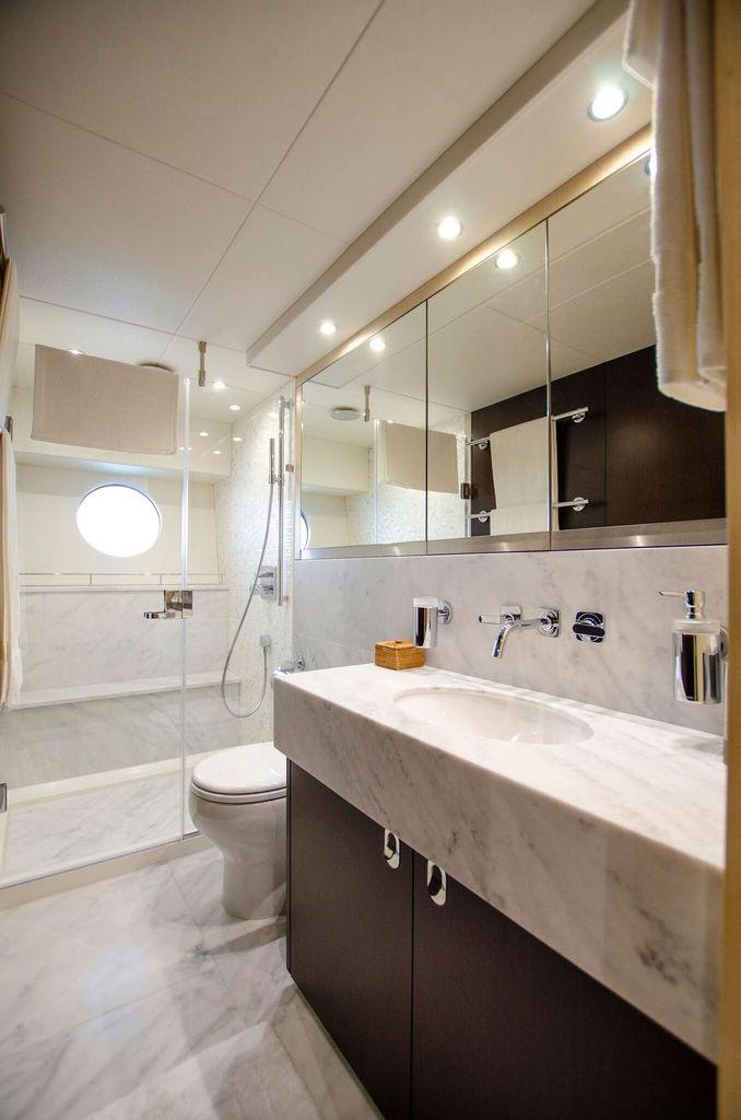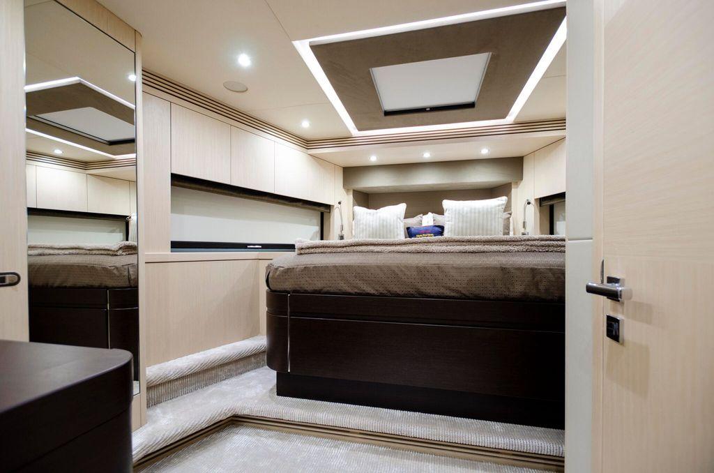 On the main deck, signature 'z' shaped windows allow plenty of natural light and nautical vistas. Below deck, four en suite staterooms comfortably accommodate up to eight guests. It’s the perfect yacht for relaxing in a secluded bay or enjoying the thrill of the ride with her twin MAN V12's @1550 hp each.