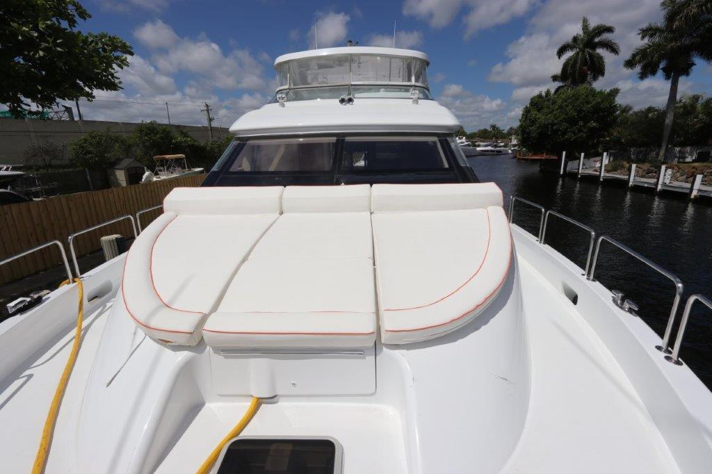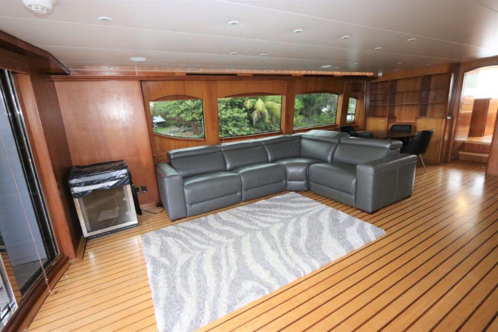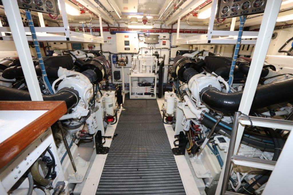 Below the full beam master stateroom has a king bed, walk-in wardrobe and vertical hullside windows. Crews quarters are aft with two staterooms, both with two single berths. Axcess to engine room is thru crews quarters either from aft swim platform or from the aft deck. Also aft deck features a full overhang, teak table and molded-in lounge. Aft deck station for engine controls is on the stbd side. Also wet bar with sink and refrig. Heavyweight Cat C-30 engines (1550 hp) will cruise the 80 to 20 knots, many new upgrades to the vessel in 2022, all new appliances, new hot top on bridge, upgraded electronics.