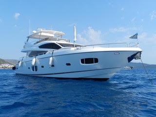 Graceful and spacious, the Sunseeker 80 Yacht enjoys the same attention to detail and scope for personalisation as the other graceful models in this range. Below deck arrangements allow for three full beam double suites, or two double guest cabins and two twin guest cabins with crew accommodation situated in the stern. With a cruising speed of 24 knots, range is around 350 nautical miles, but at full throttle the yacht will provide a comfortable 28-30 knots. She has a large flybridge providing separate helm position, ample seating and sunbathing space while the large aft submersible bathing platform provides plenty of space to carry a tender or jet skis.