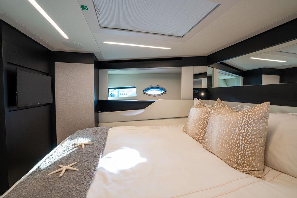 The twin engines ensure speeds of 45 knots in the standard version and up to 48 knots in the optional configuration. Pershing 8X is equipped with the groundbreaking system that integrates propulsion control with the manoeuvring, navigation and monitoring systems, which is accessible to the pilot via large natural carbon panels and 24" touchscreen monitors.