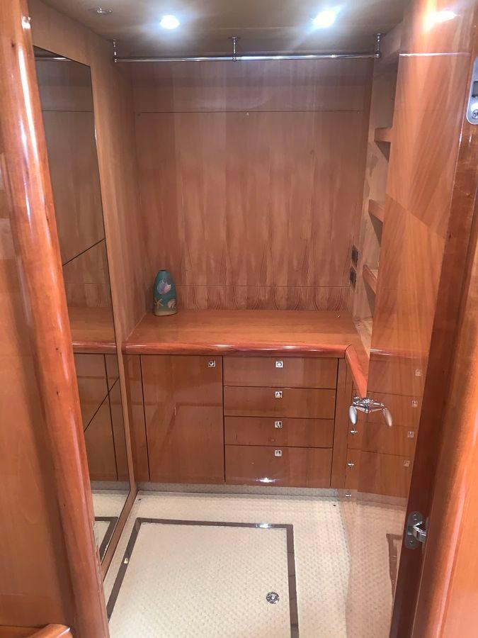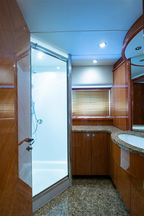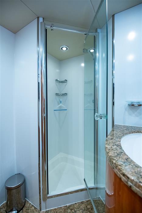 Accommodations include 4 staterooms plus crew quarters with three berths. The entrance to the Master Suite is majestic featuring a beautiful glass sculpture framed by cherry wood and suede. On either side are the his & hers closets. Spacious and elegant, the master stateroom features a disappearing TV, loveseat and vanity. The Master head features a jacuzzi tub, granite floors and countertops and marble shower walls. This is the preferred Master suite layout. The VIP Stateroom is exceptionally large and will overwhelm your special guests. The en-suite head features marble shower walls, granite floors and countertops. The suite also has a large walk-in closet. The double twin berth staterooms are light and bright.