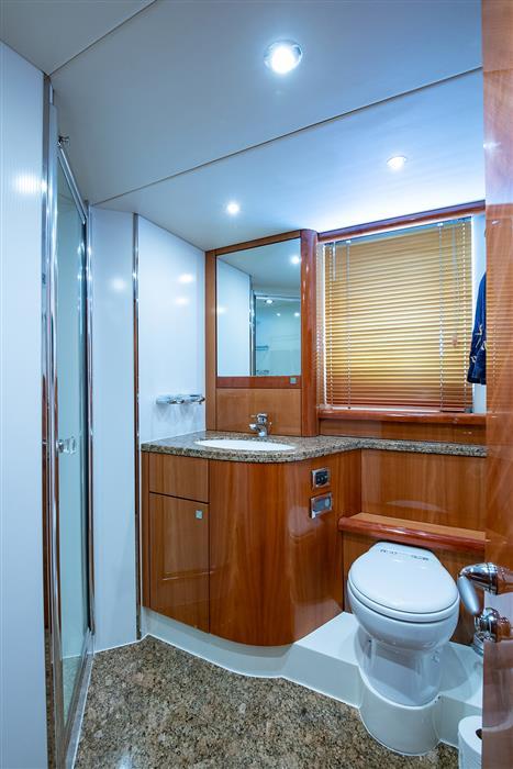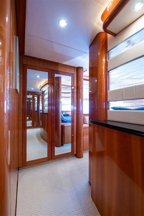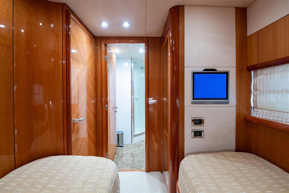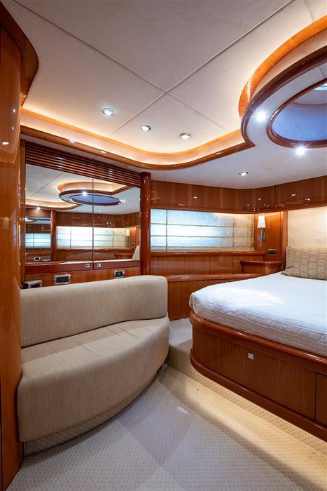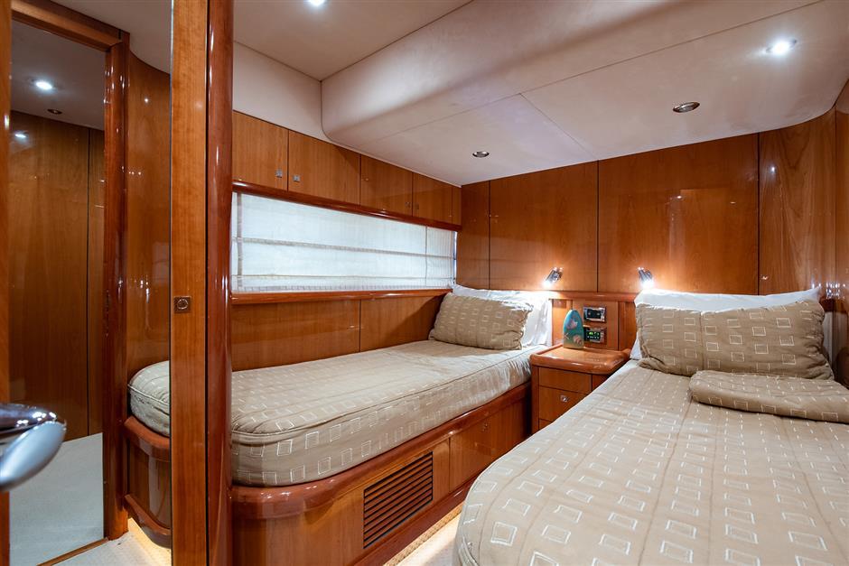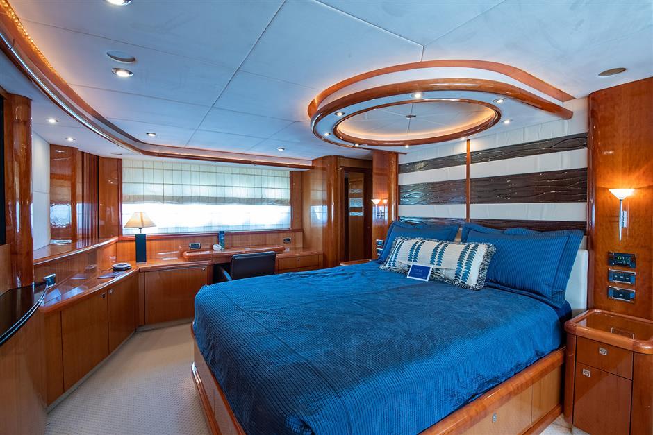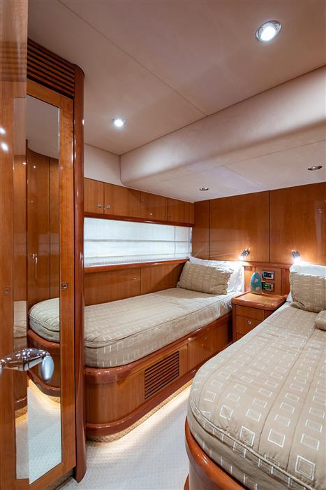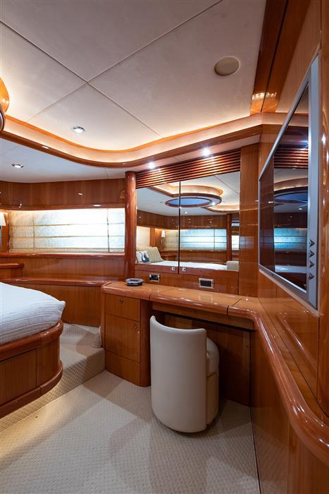 Accommodations include 4 staterooms plus crew quarters with three berths. The entrance to the Master Suite is majestic featuring a beautiful glass sculpture framed by cherry wood and suede. On either side are the his & hers closets. Spacious and elegant, the master stateroom features a disappearing TV, loveseat and vanity. The Master head features a jacuzzi tub, granite floors and countertops and marble shower walls. This is the preferred Master suite layout. The VIP Stateroom is exceptionally large and will overwhelm your special guests. The en-suite head features marble shower walls, granite floors and countertops. The suite also has a large walk-in closet. The double twin berth staterooms are light and bright.