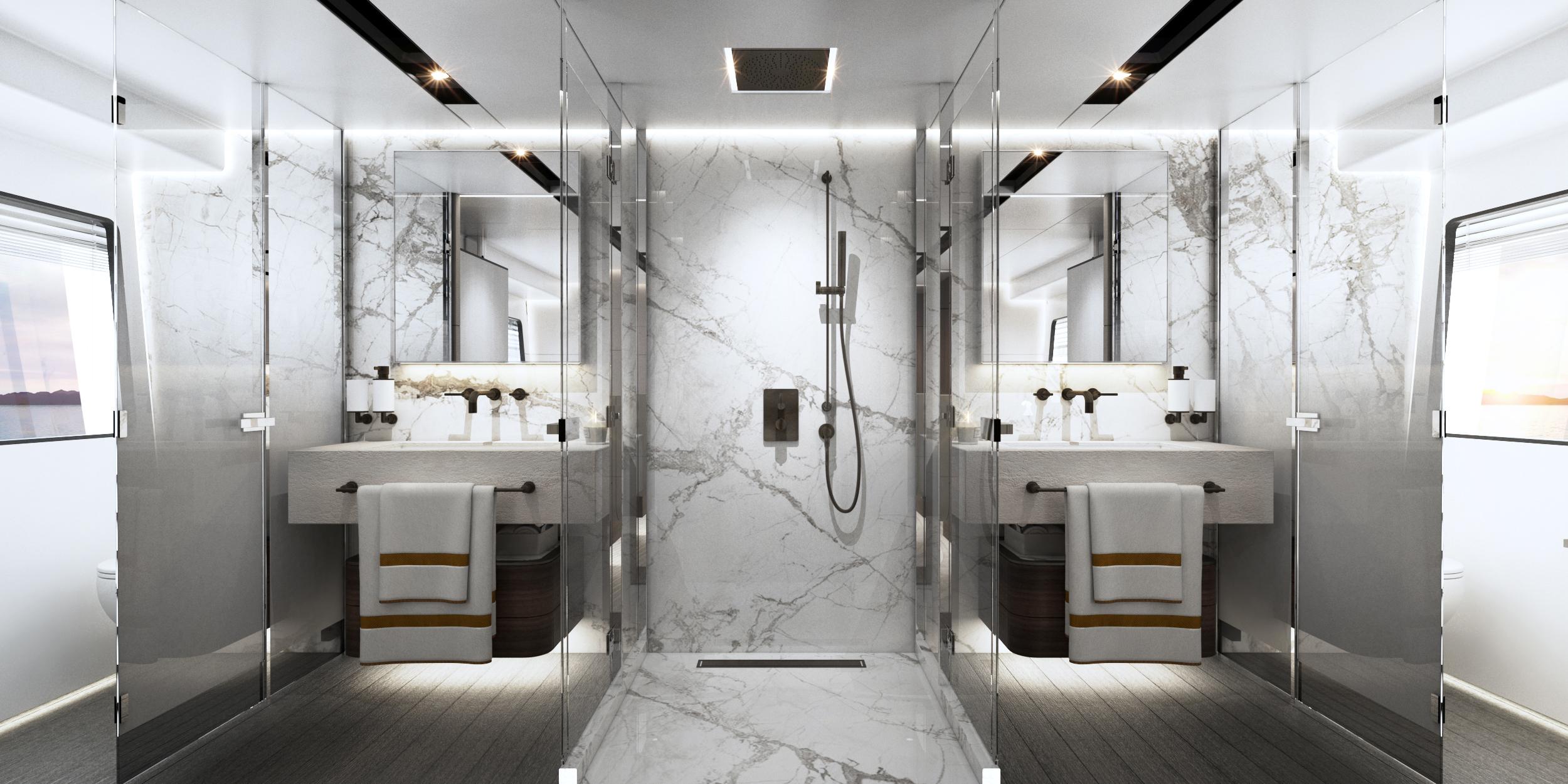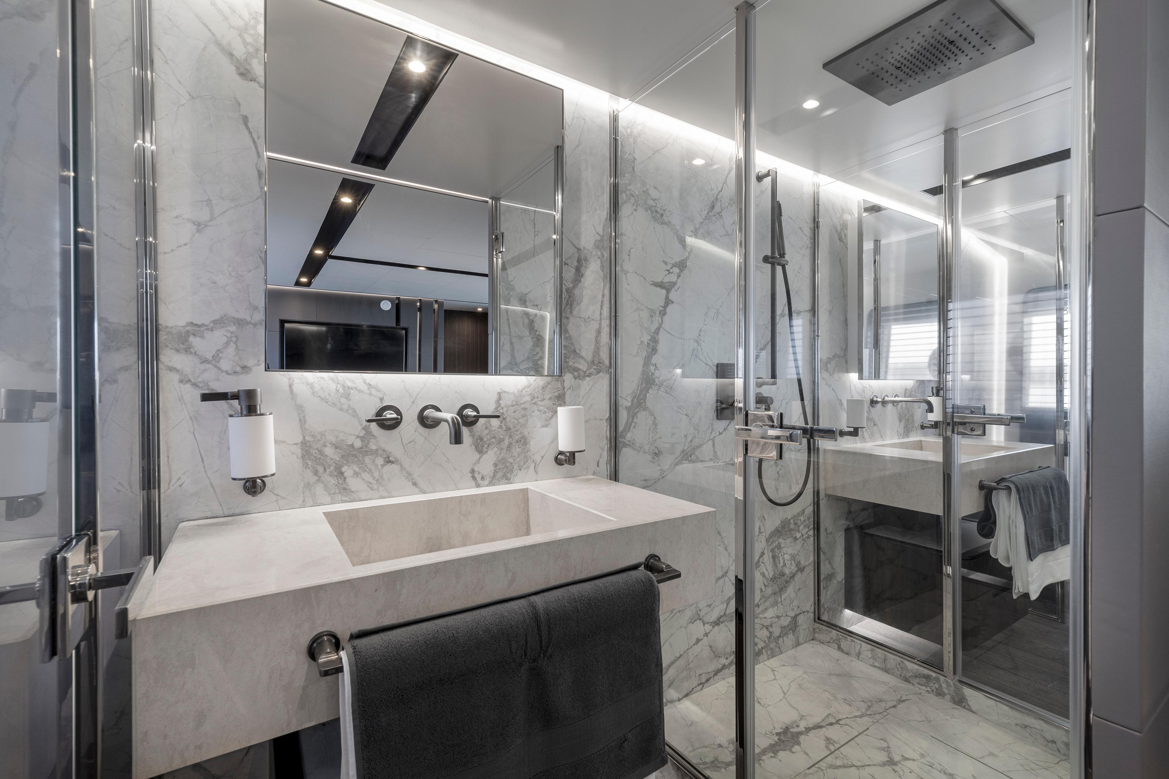 The lower deck is home to the owner’s stateroom and three other cabins, all with ensuite bathrooms. Two crew cabins complete the night-time spaces of this yacht.