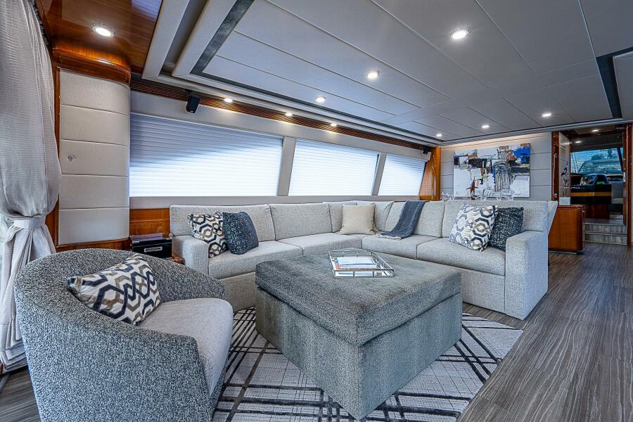 From the aft deck, are large sliding stainless steel and glass doors that allow entrance to the Salon. To port is an Occasional Chair, Side Table, Custom Ottoman, and L-Shaped Sofa. To starboard is an under-counter Refrigerator, Bottle Storage Cabinet, Large Screen TV on Lift, Stereo System, Satellite TV Boxes, and Storage Compartments. The flooring is faux wood throughout the salon, galley and pilothouse.