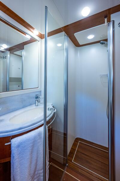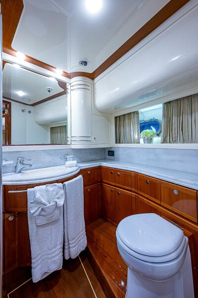 Additional DescriptionThe large lounge (4.5 x 6 metres) is dominated by an L-shaped sofa which has both a central table and a small side table. On the right there is a conversation area comprising two small armchairs positioned against the display that houses the pop-up plasma-screen TV. The lounge can comfortably seat eight people to eat, and the crew has easy access to the kitchen from an external gangway. The lounge also has a day head that acts as a division between lounge and bridge. The bridge has a new layout which is much more cosy. Next to the bridge there is a comfortable and spacious diner for two people with a map table, to enable shared navigation. Below deck, the master cabin is situated amidships and was designed to be laid out beam-wise. The bed-head is positioned in the centre of the cabin, below a window giving a view of the sea. The master cabin also has two walk-in wardrobes, a women''s vanity unit alongside a chaise-longue, and two communicating heads with dual access. The central corridor leads to the two guest cabins which have twin beds. Each has its own head with shower. Continuing towards the bows you come to the spacious VIP cabin with double bed and head.