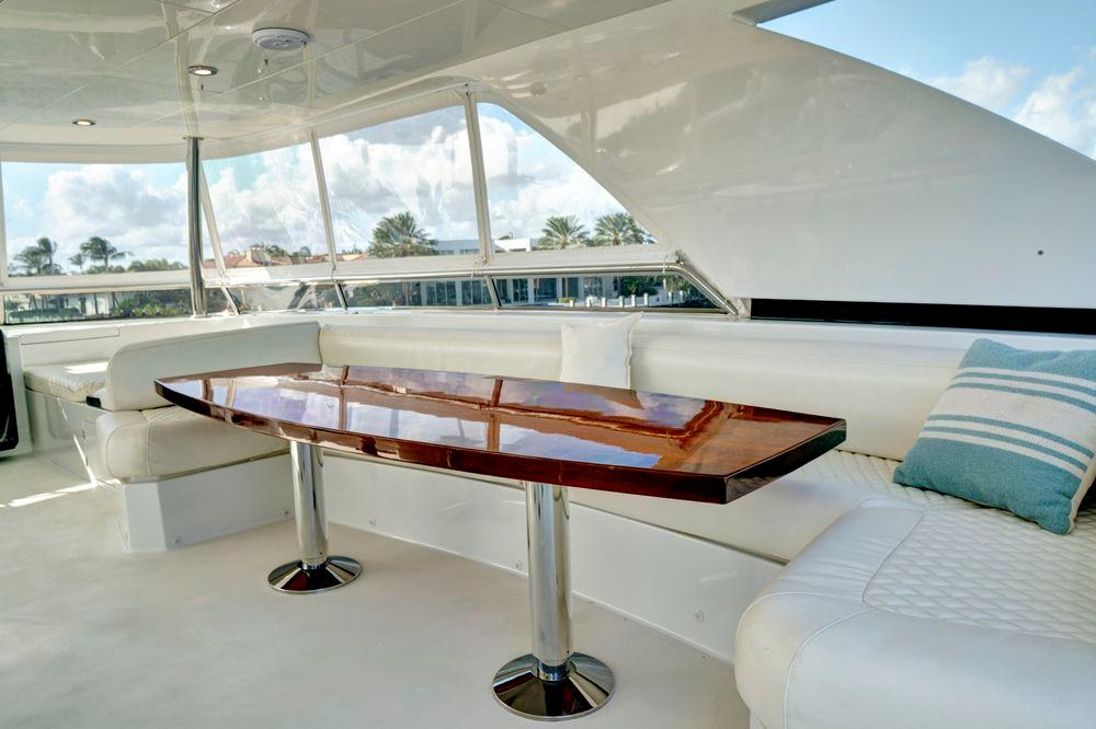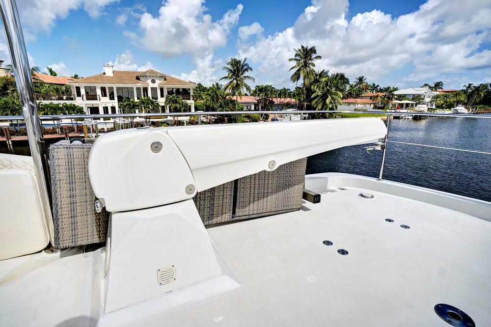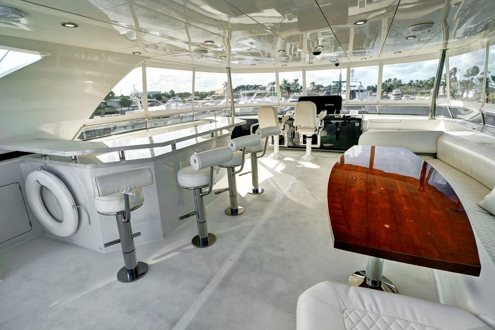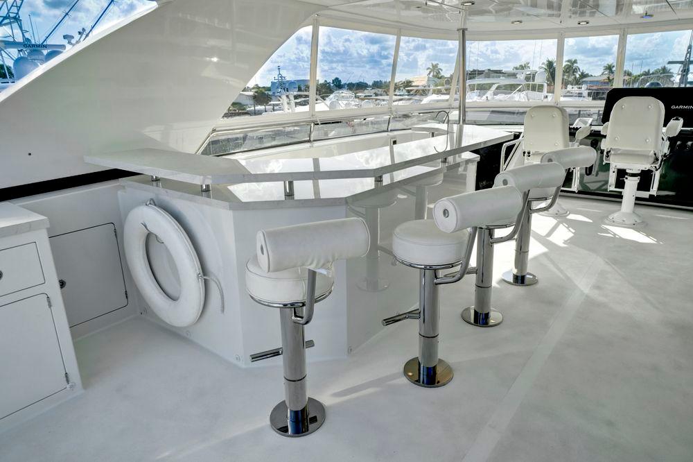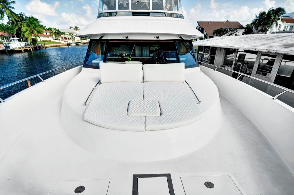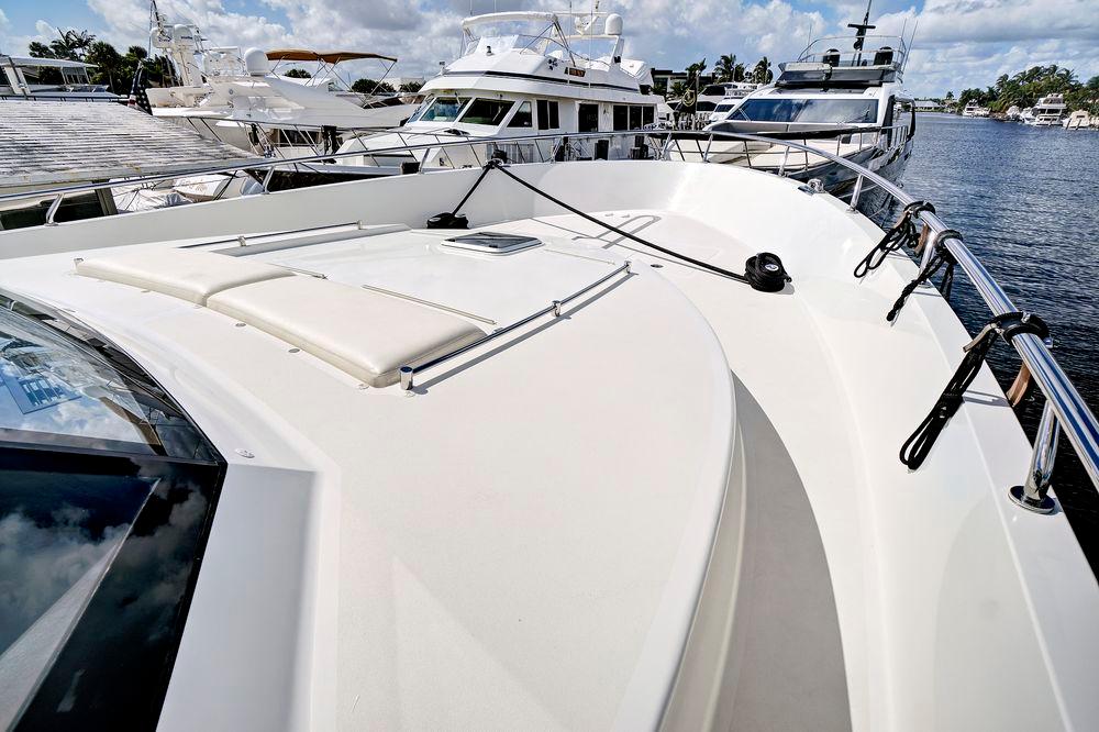 The oversized bow features brand new upholstery for sunbathing and a concealed anchor locker that allows for additional space in the event an owner wanted to add chairs while at the dock or anchor. The Bow is accessed by port and starboard teak laid walk ways that are wide and high for added safety