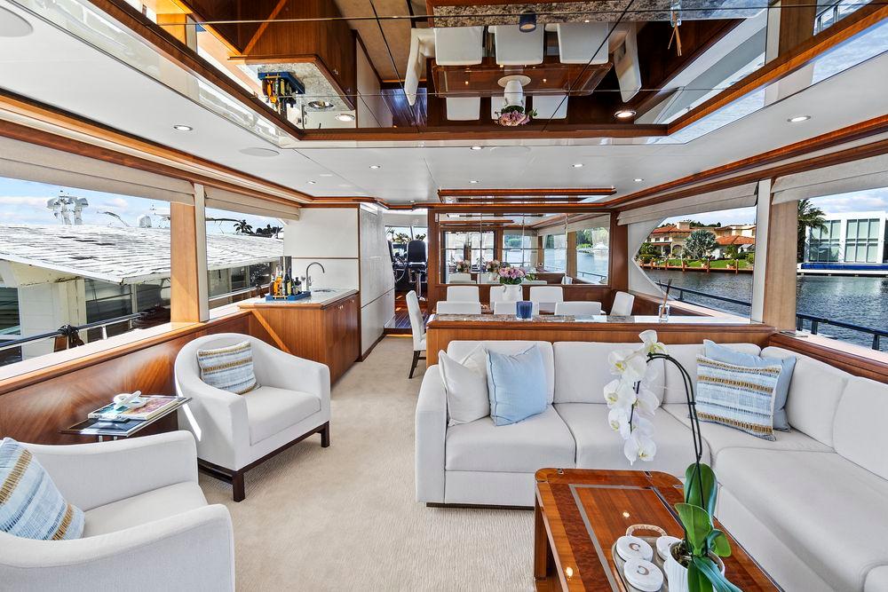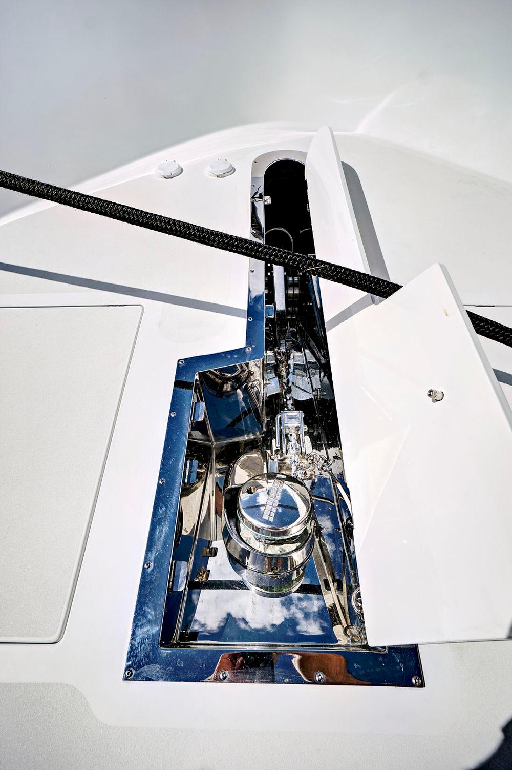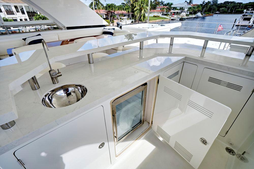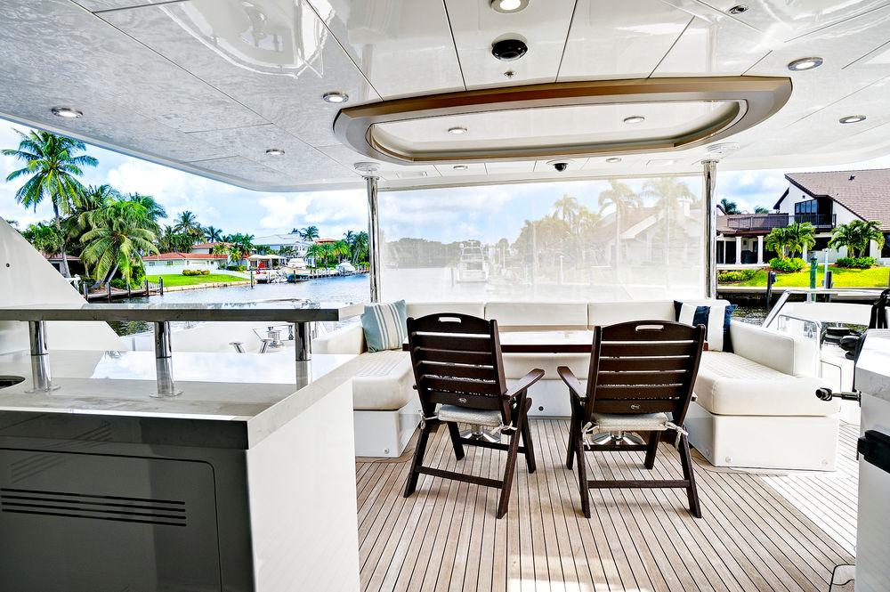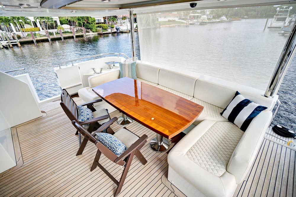 The oversized bow features brand new upholstery for sunbathing and a concealed anchor locker that allows for additional space in the event an owner wanted to add chairs while at the dock or anchor. The Bow is accessed by port and starboard teak laid walk ways that are wide and high for added safety