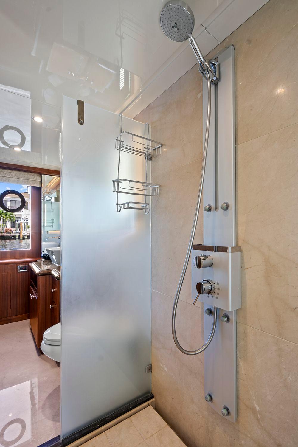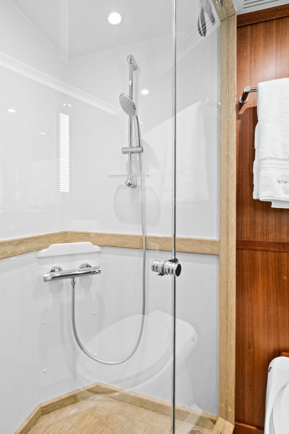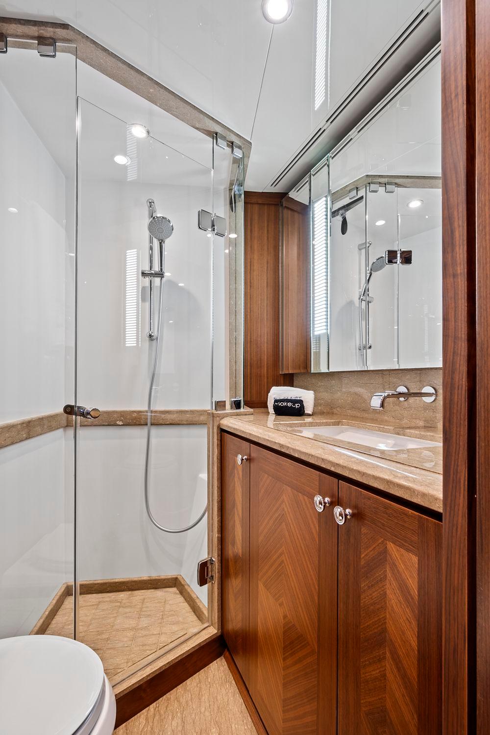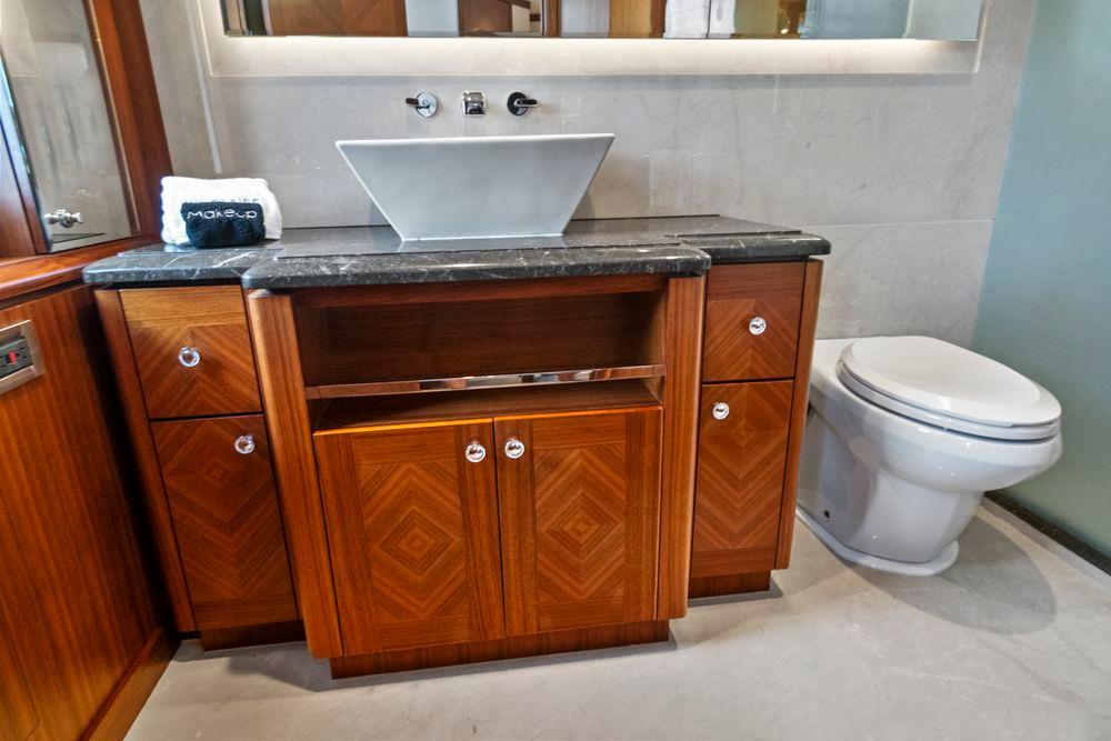 Number two on the “Wow Factor” is the Master Stateroom. Welcome to pure luxury and comfort. Upon entering you will notice large vertical windows that are on the port and starboard side, these allow the natural light to pour in like the above salon windows. Center of the room is a massive king size bed that is very inviting. The entire living area offers a his and her living space with twin walk-in cedar lined closets, make-up desk with storage to the starboard side, and multi-drawer dresser to the port side for great storage. Keeping with the his and her living space, there is a full beam master bathroom with twin sinks and heads on each side that meet in the middle with an oversized glass incased shower. This master stateroom like the rest of the vessel has been addressed during the refit and is sure to impress.