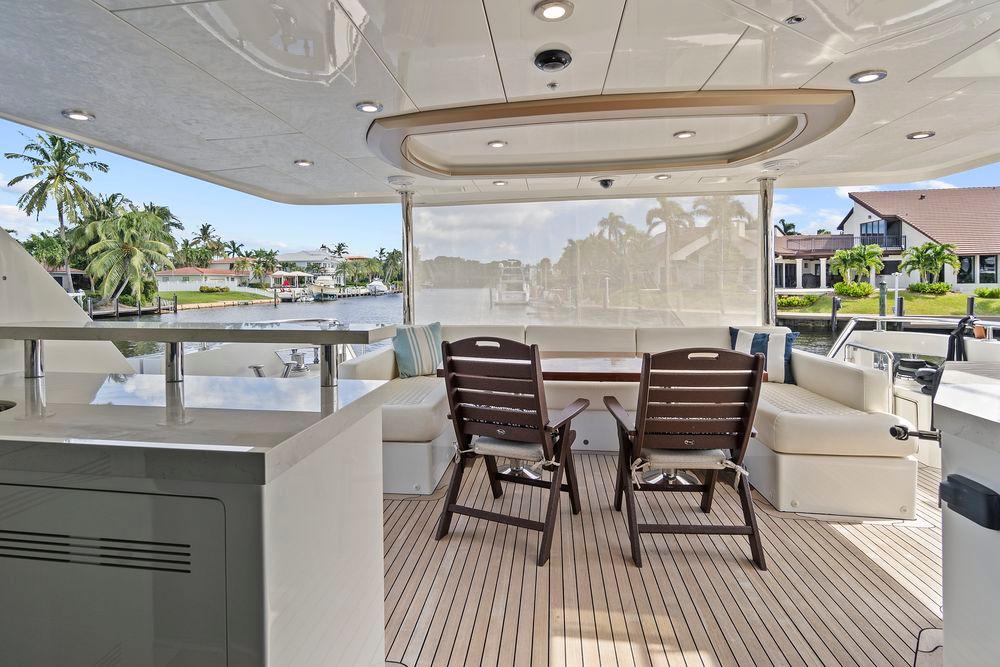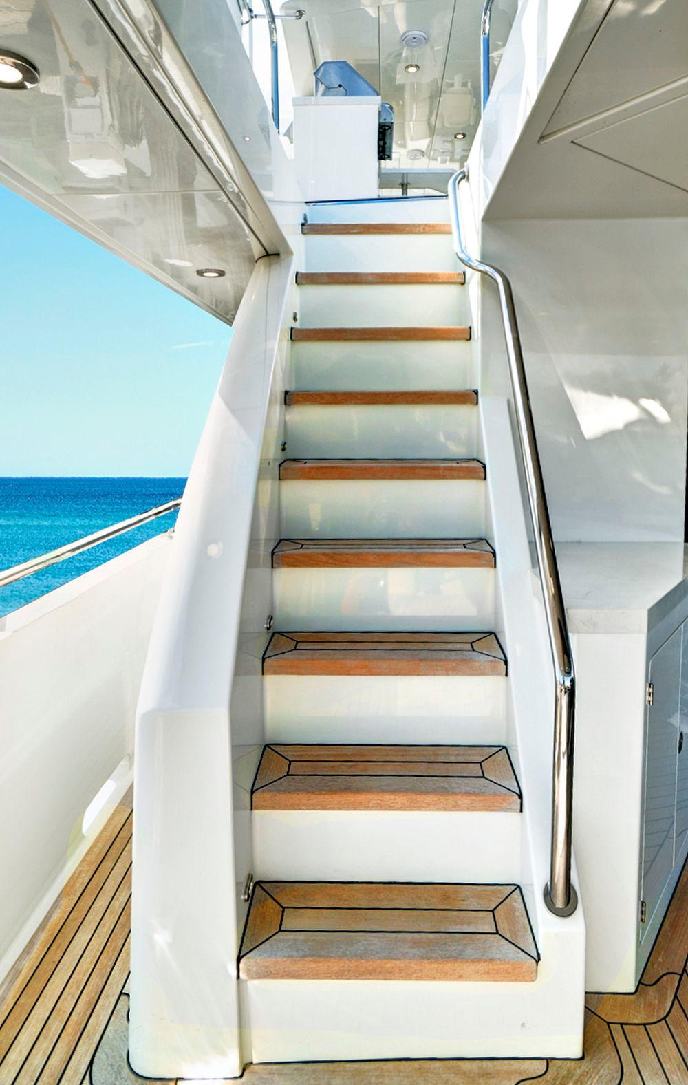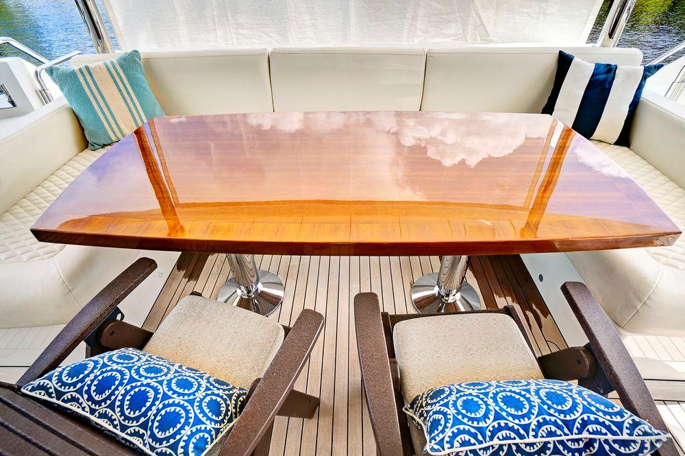 The Aft Deck is accessible from either side of the boarding doors via a sturdy set of tide runner stairs or from coming up the beautiful teak laid platform after a swim or disembarking from the tender. Once you enter the large aft deck, it's perfect for entertaining. Featured is a large u-shaped seating area with all new upholstery and a beautiful teak table, with two movable chairs for additional seating. There is also a aft sun shade to keep the heat from the sun at bay. Just forward of the seating is a new re-designed wet bar with a water dispenser with purified drinking water straight from the sink. Undercounter is a new Ice-Maker and storage cabinet. Other notable features to the amazing Aft Deck area are the port and starboard Capstans with foot pedal operation to assist in tightening lines when docking, large port and starboard teak laid walk ways to the bow, crew and engine room access door, and large vertical staircase to the bridge.