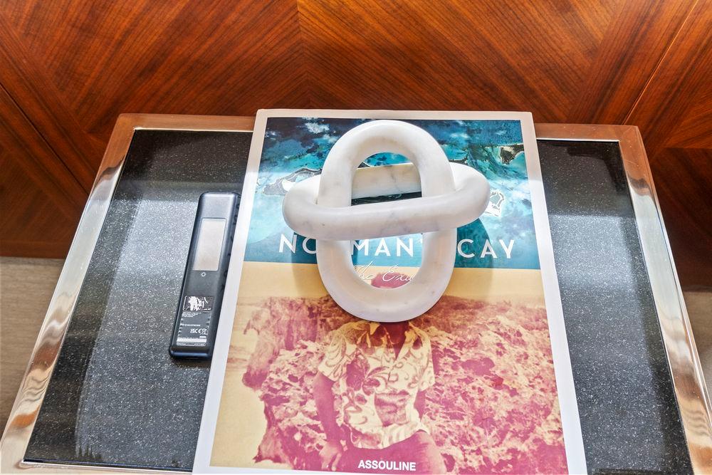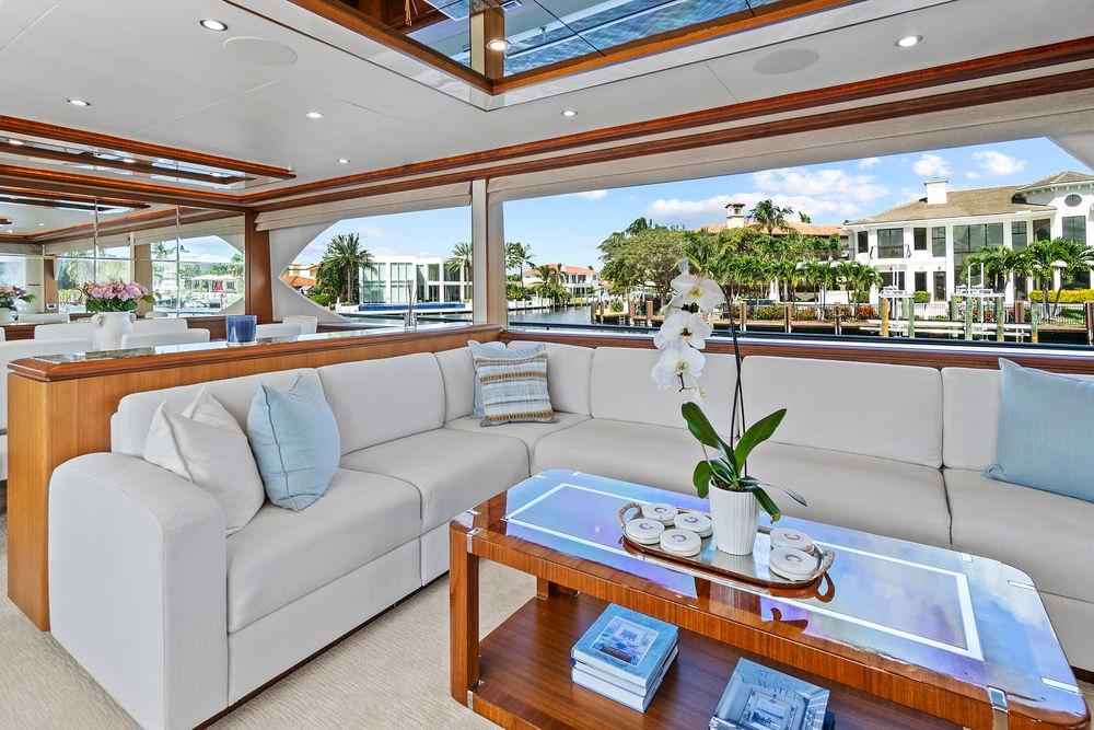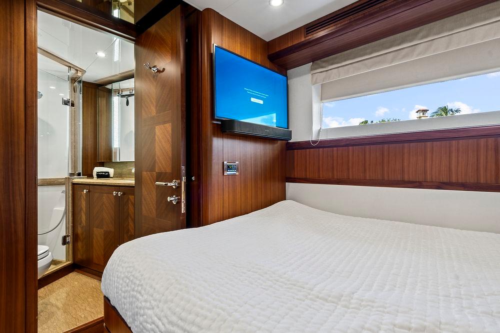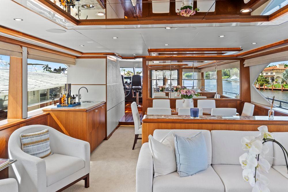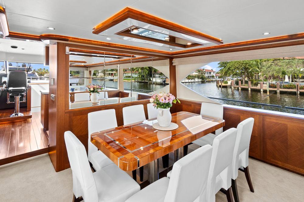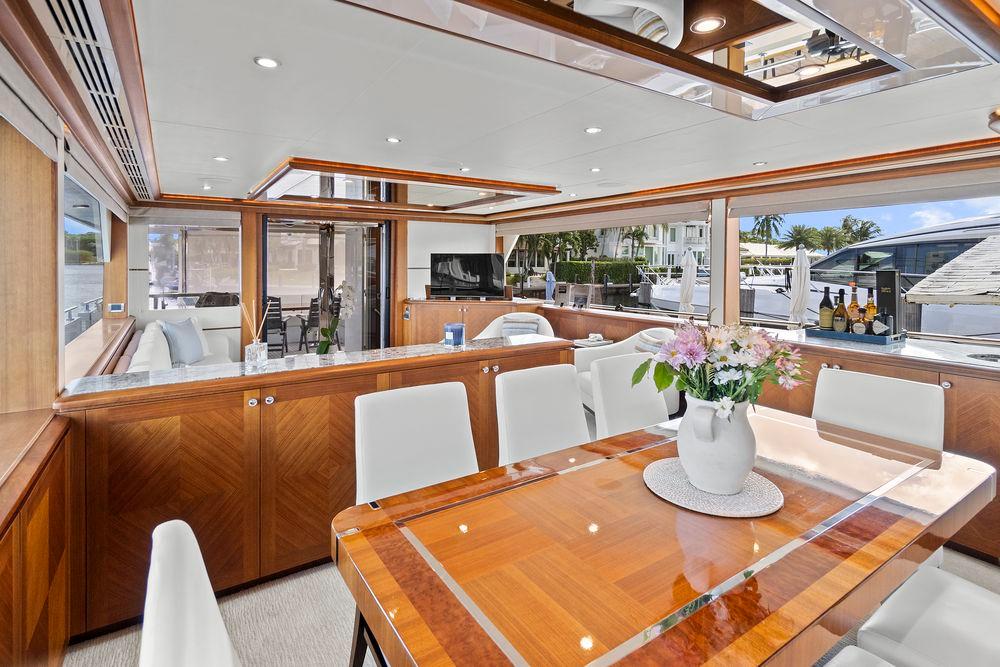 Entering from a set of automatic sliding salon doors you truly enter one of the many “Wow Factors” this yacht presents. Immediately you are taken back by the large windows that run the entire length of the vessel and pours in natural light and gives amazing exterior views. Turn to the port side, there is a brand new rising and falling flat screen smart TV. Forward of the that on the port side are two brand new barrel chairs that sit directly across from an extra-large and comfortable L-shaped couch and coffee table. Moving forward through the salon we come to a large dining table for eight, accompanied by a bar setup for making fresh cocktails, that features ample under counter storage, wine fridge, glass storage, and another sink disposing fresh drinking water that is processed through the vessels water purification system. Finally, one of the salons unique features is the Day Head under the bridge stairs and storage lockers that seem to blend right in to the wall. On a final note, it is important to express how everything in this area has been addressed in the recent refit in 2024.