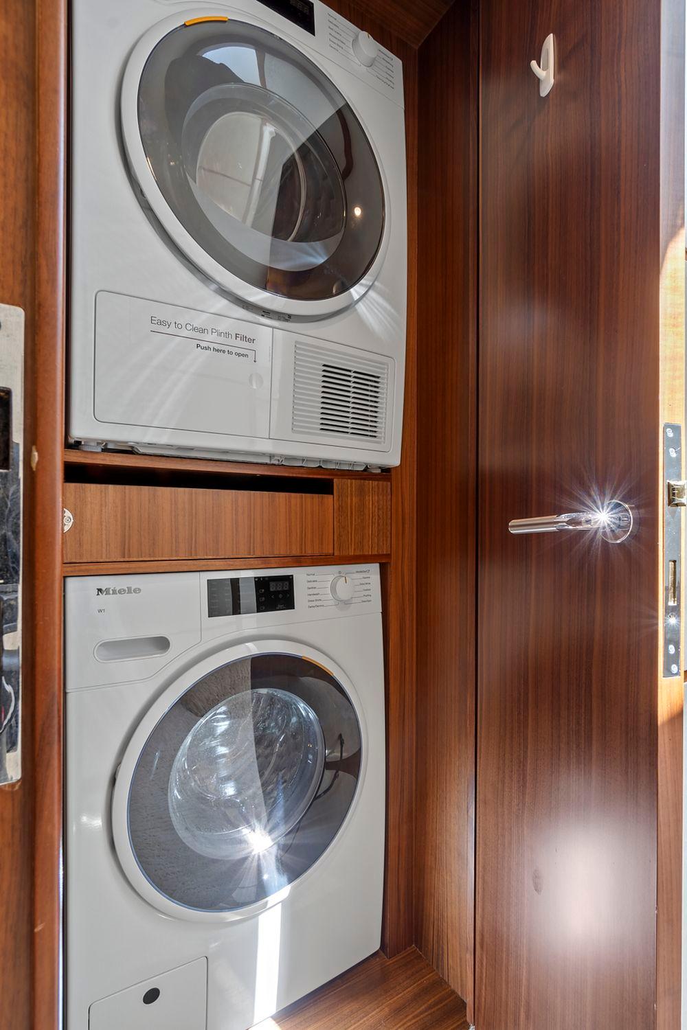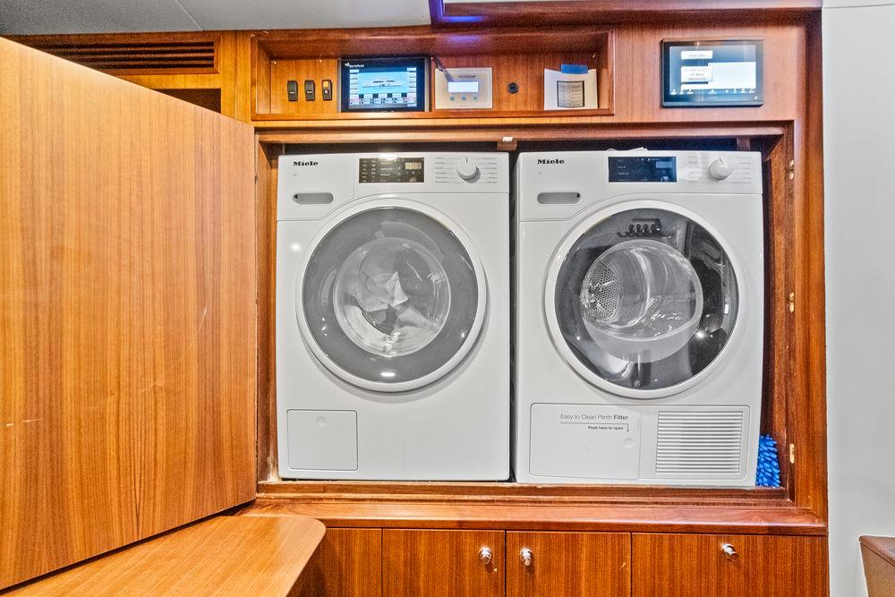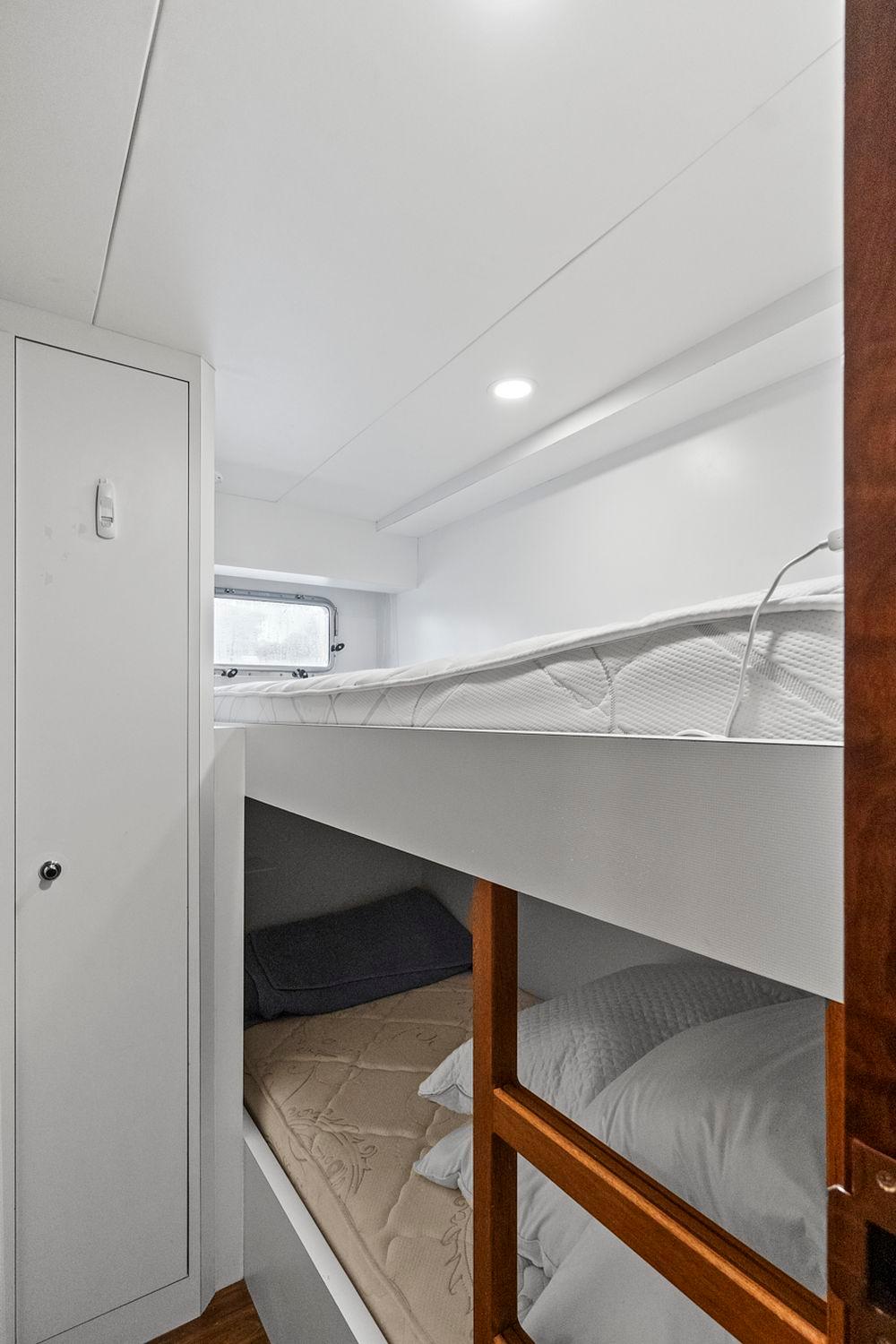 Aft of the vessel is a very nicely appointed and well-equipped crew quarters. As you enter down the stairs through the aft cockpit there is a separate washer/dryer and yacht monitoring systems. At the bottom of the staircase is a crew mess hall galley. On the starboard side there are two staterooms one for the captain and another for two more crew members. A full-size head with shower allows the crew to have all the comforts of home. Forward of the crew is the engine room that is neat, clean, and organized with all services up to date as of September 2024. Note that aft of engine room and crew there is a water tight door that enters to a clean lazarette area that goes out to the swim platform, so crew can come and go without having to enter the topside aft deck for ultimate owner privacy.