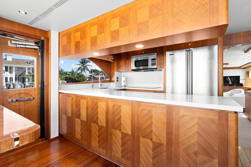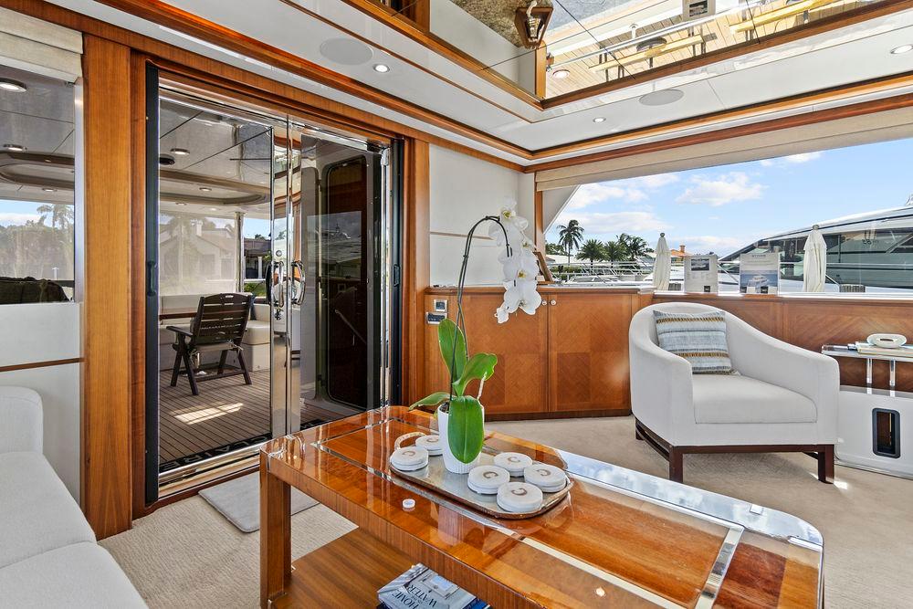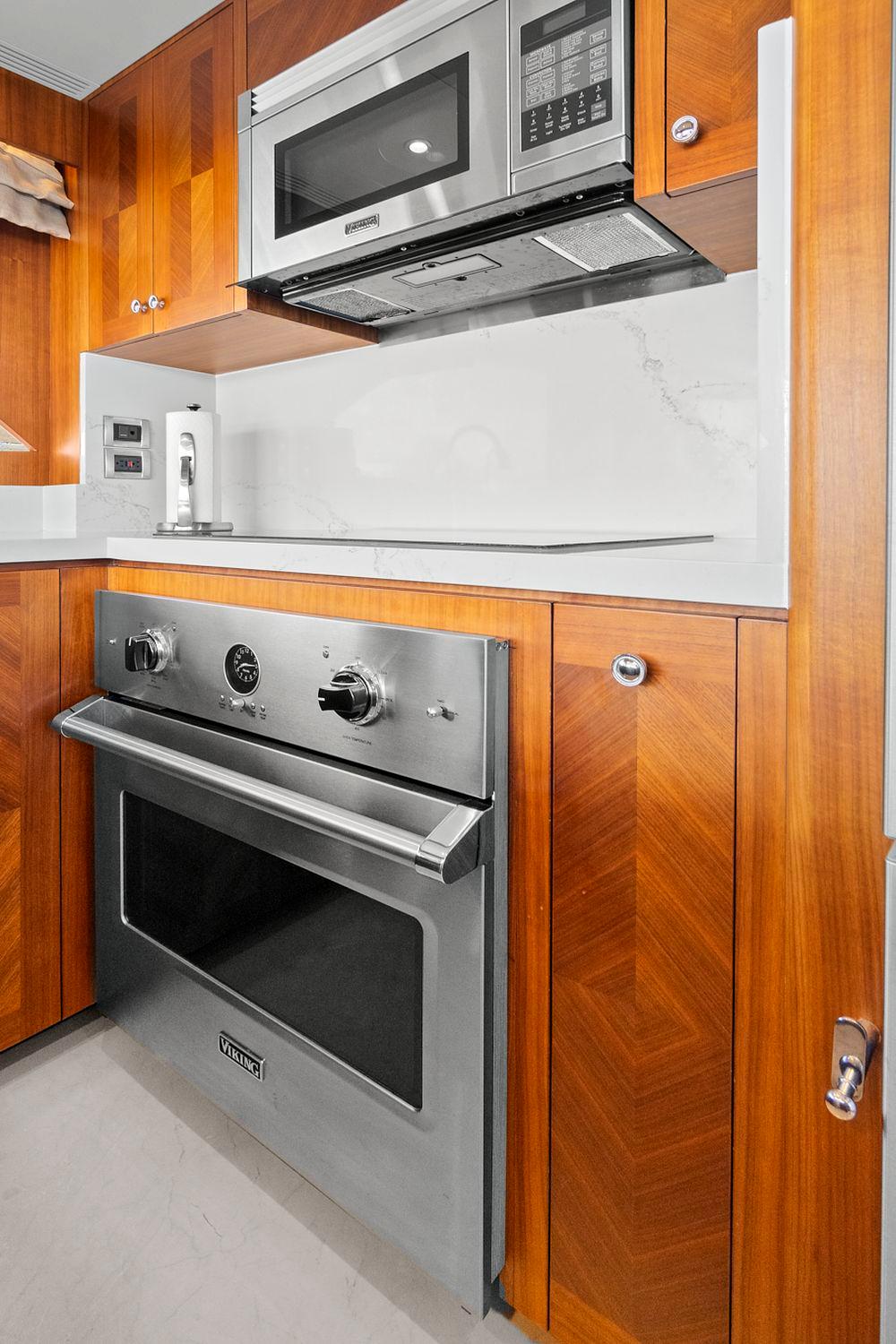Walking from the Salon you enter a space that combines so much. Beginning with beautiful hardwood floors there are port and starboard wing doors to access the outside of the vessel and a large stair case that leads to the fly bridge. Forward to port is the lower helm station and what I like to call “Mission Control”. The lower helm is stunning twin Stidd chairs that go Hi/Low and features a remote for the new Garmin Navigation that was added to the vessel during its 2024 refit. At the helm there is every feature a true yachtsman wants to see. The brand-new oversized Garmin 9000 Series Navigation screens will give you a plotter, radar, various exterior live view cameras around the vessel, new FLIR Night Vision, and finally the newly installed Octoplex 2.0 Yacht Monitoring System. In addition to all that is new Bow & Stern Thruster proportional controls and new throttle controls. Moving to your starboard side forward is an L-Shaped seating are with all new upholstery and hi gloss table. This area can be a great spot to enjoy lunch or a great work area for the captain or owner. Finally, the star of the show in this forward area is all new galley that has been outfitted with top-of-the-line Viking and Meile appliances, all new counter tops, ample storage, and a third station at the sink for dispensing purified drinking water. This galley will allow for preparing family meals or catering to large events being held on the yacht.