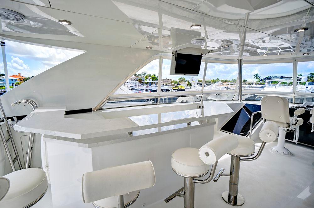 Number 3 on the “Wow Factor” and sure to be the best of the 3 is the Fly-Bridge. Front to back this area is like an adult playground and offers massive entertaining space and storage for tenders and toys. Beginning aft, is a hydraulic davit that will deploy your tenders for a day of exploring on the water. Once the tenders are cleared, you and your guests have ample space for sunbathing or gathering for sunset cocktail’s. Just forward is a full-size Jacuzzi and across from the Jacuzzi is a custom-built BBQ that can grill for many guests at once vs other brands, that offer small inefficient electric griddle tops. Once you enter the underside of the massive hardtop you are welcomed with a large bar area with seating. Opposite of the bar is a large u-shape seating are with more seating forward for lounging. To the Port side forward there is a glass door that grants access to the lower level of the vessel. The upper helm station is another upgraded "Mission Control" with duplicate features that are down below in the pilot house. In addition to this amazing space, it shall be noted that everything on the flybridge is new from upholstery, canvas enclosure, to appliances at the bar including a 4th and final fresh water drinking dispenser at the bar sink.