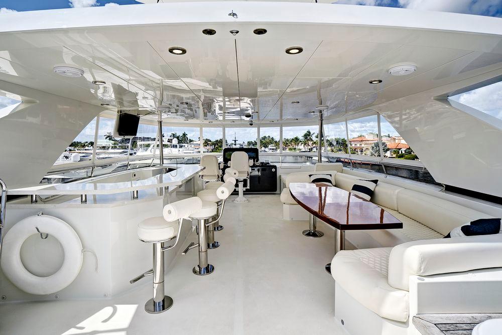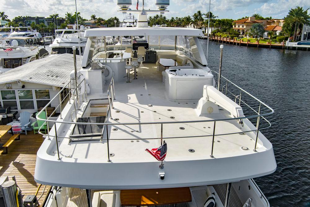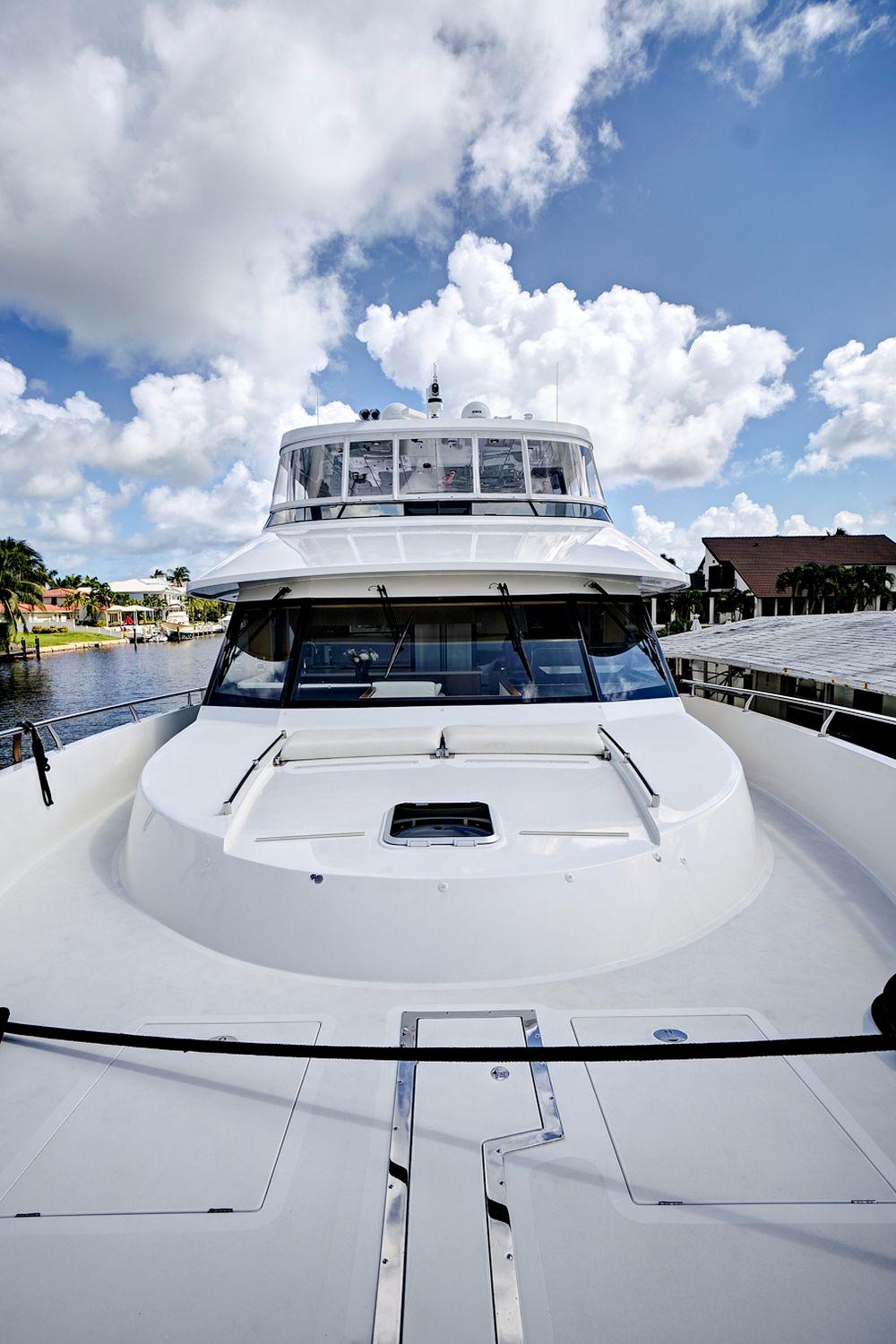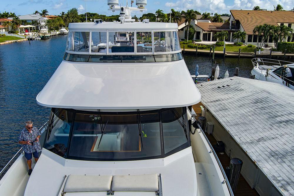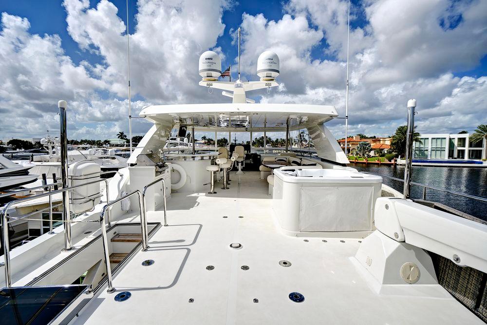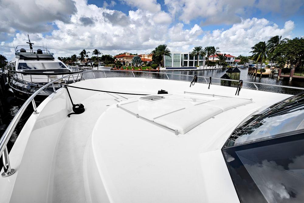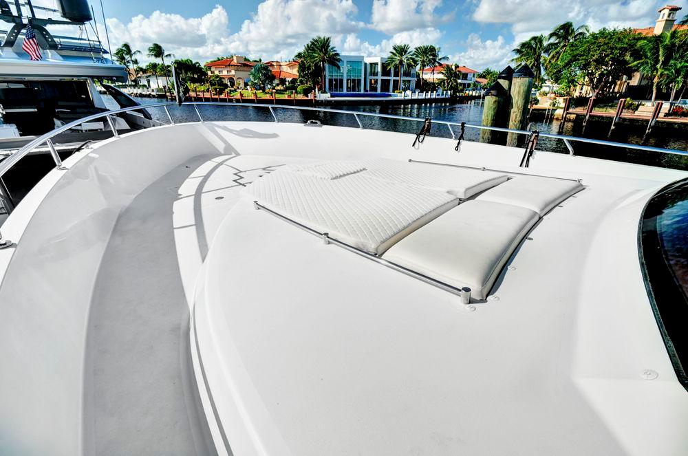 The oversized bow features brand new upholstery for sunbathing and a concealed anchor locker that allows for additional space in the event an owner wanted to add chairs while at the dock or anchor. The Bow is accessed by port and starboard teak laid walk ways that are wide and high for added safety