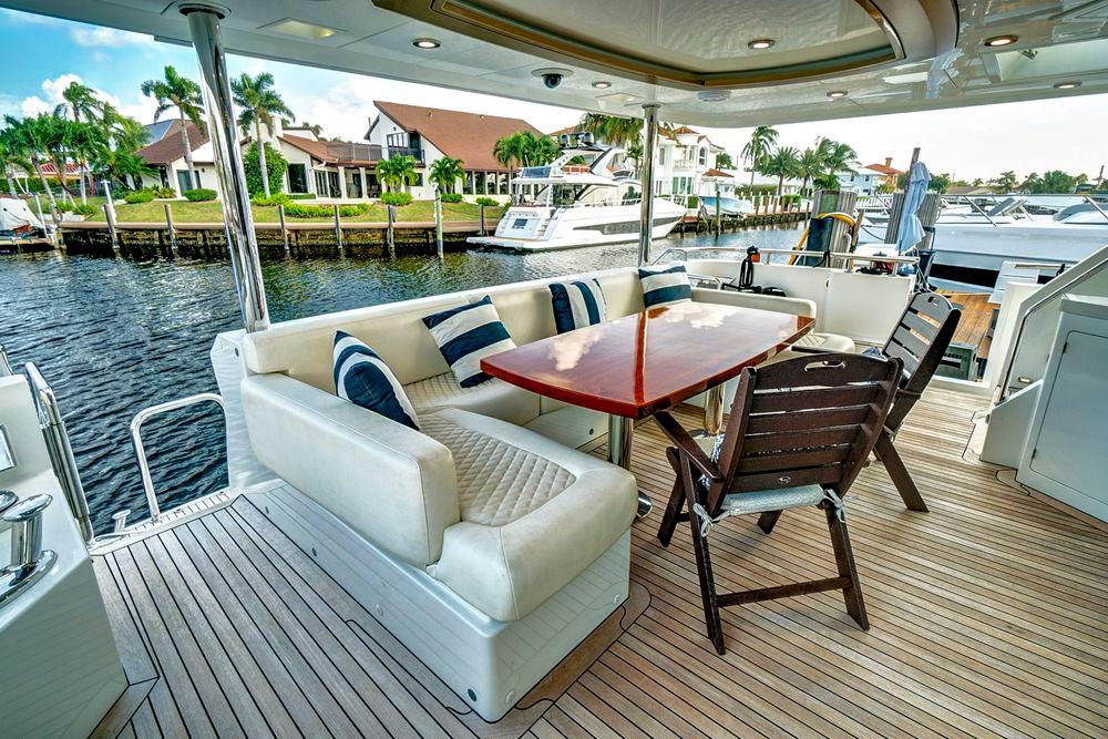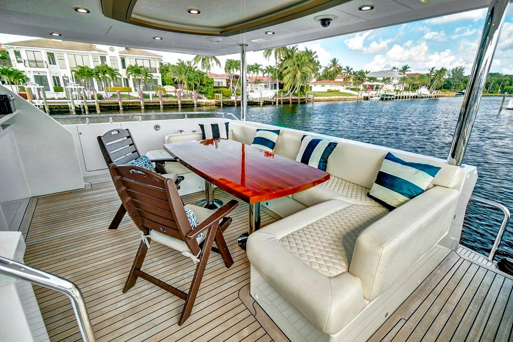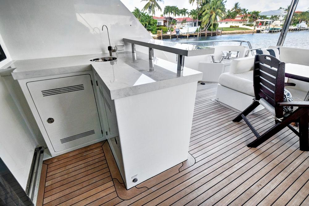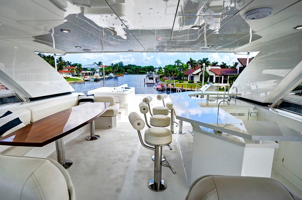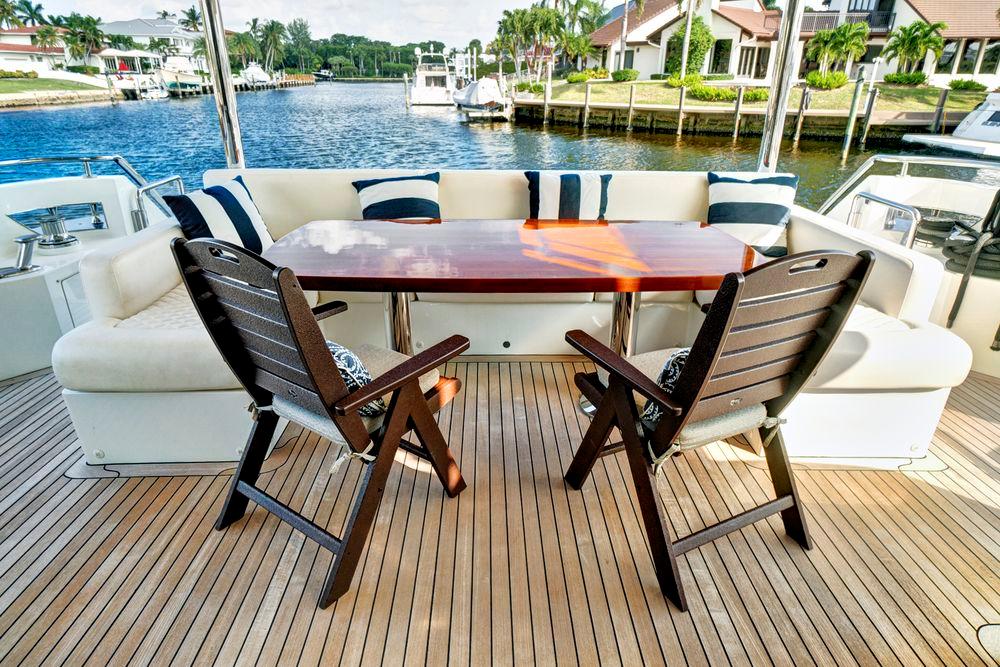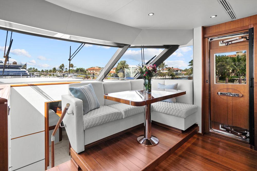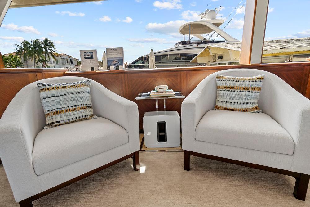 The oversized bow features brand new upholstery for sunbathing and a concealed anchor locker that allows for additional space in the event an owner wanted to add chairs while at the dock or anchor. The Bow is accessed by port and starboard teak laid walk ways that are wide and high for added safety