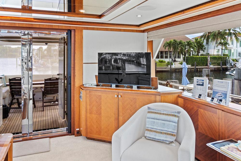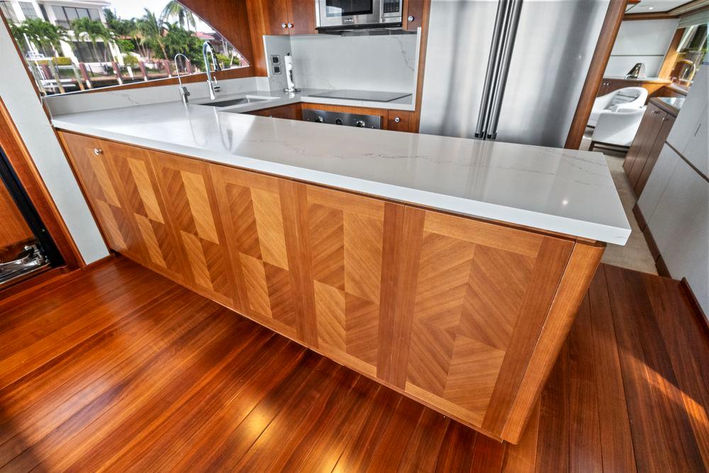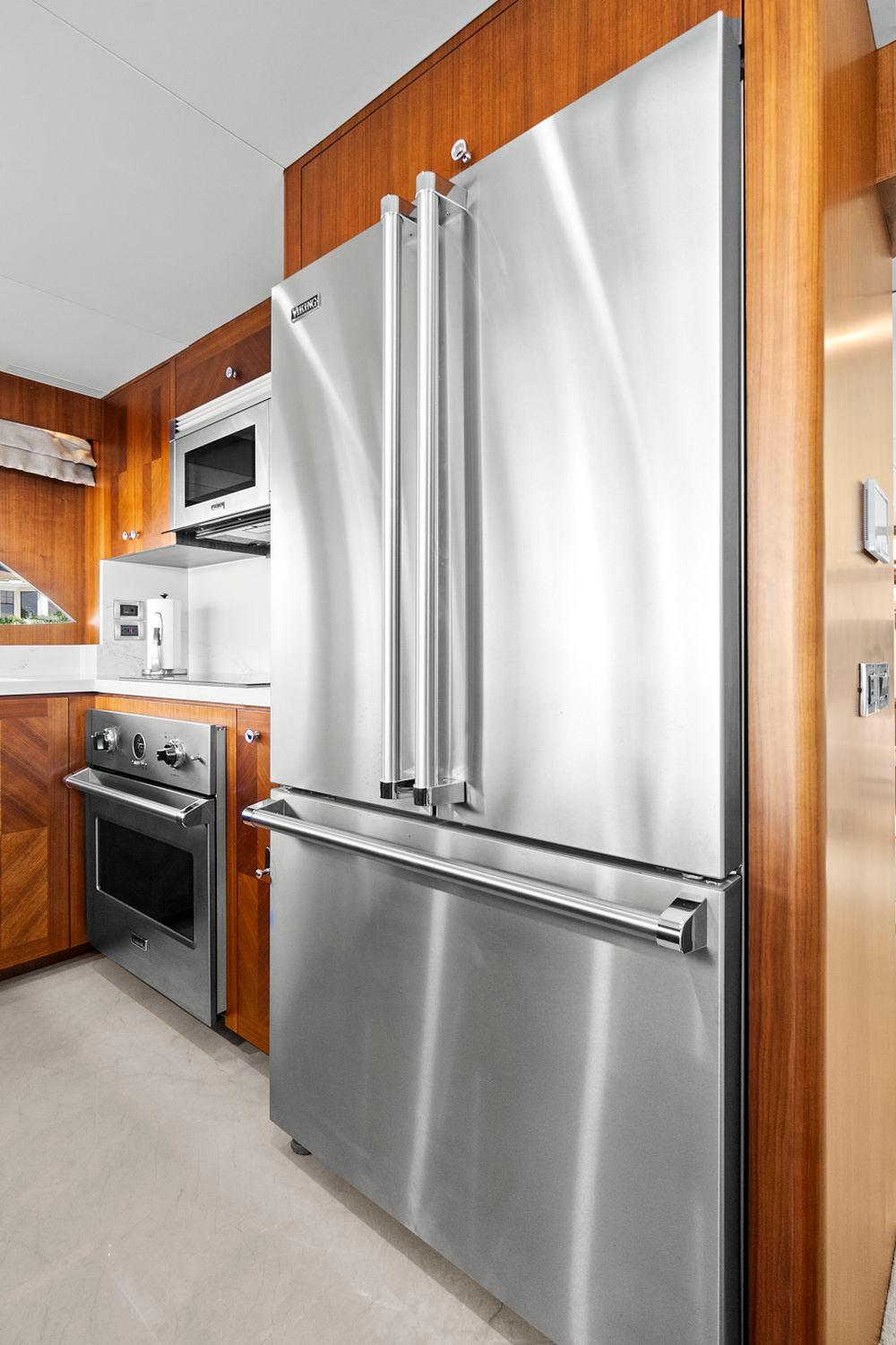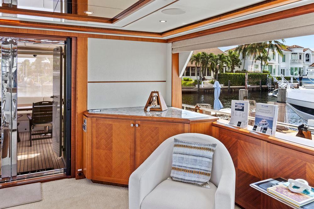 Walking from the Salon you enter a space that combines so much. Beginning with beautiful hardwood floors there are port and starboard wing doors to access the outside of the vessel and a large stair case that leads to the fly bridge. Forward to port is the lower helm station and what I like to call “Mission Control”. The lower helm is stunning twin Stidd chairs that go Hi/Low and features a remote for the new Garmin Navigation that was added to the vessel during its 2024 refit. At the helm there is every feature a true yachtsman wants to see. The brand-new oversized Garmin 9000 Series Navigation screens will give you a plotter, radar, various exterior live view cameras around the vessel, new FLIR Night Vision, and finally the newly installed Octoplex 2.0 Yacht Monitoring System. In addition to all that is new Bow & Stern Thruster proportional controls and new throttle controls. Moving to your starboard side forward is an L-Shaped seating are with all new upholstery and hi gloss table. This area can be a great spot to enjoy lunch or a great work area for the captain or owner. Finally, the star of the show in this forward area is all new galley that has been outfitted with top-of-the-line Viking and Meile appliances, all new counter tops, ample storage, and a third station at the sink for dispensing purified drinking water. This galley will allow for preparing family meals or catering to large events being held on the yacht.