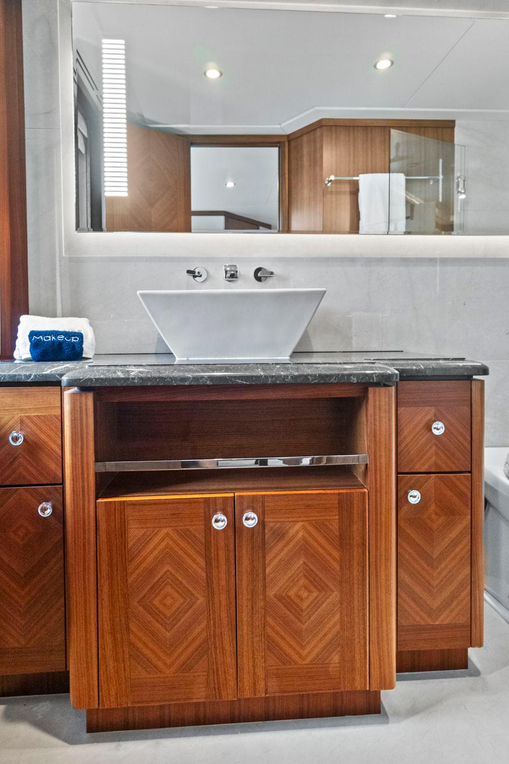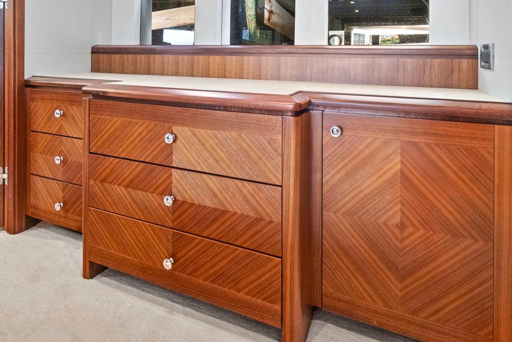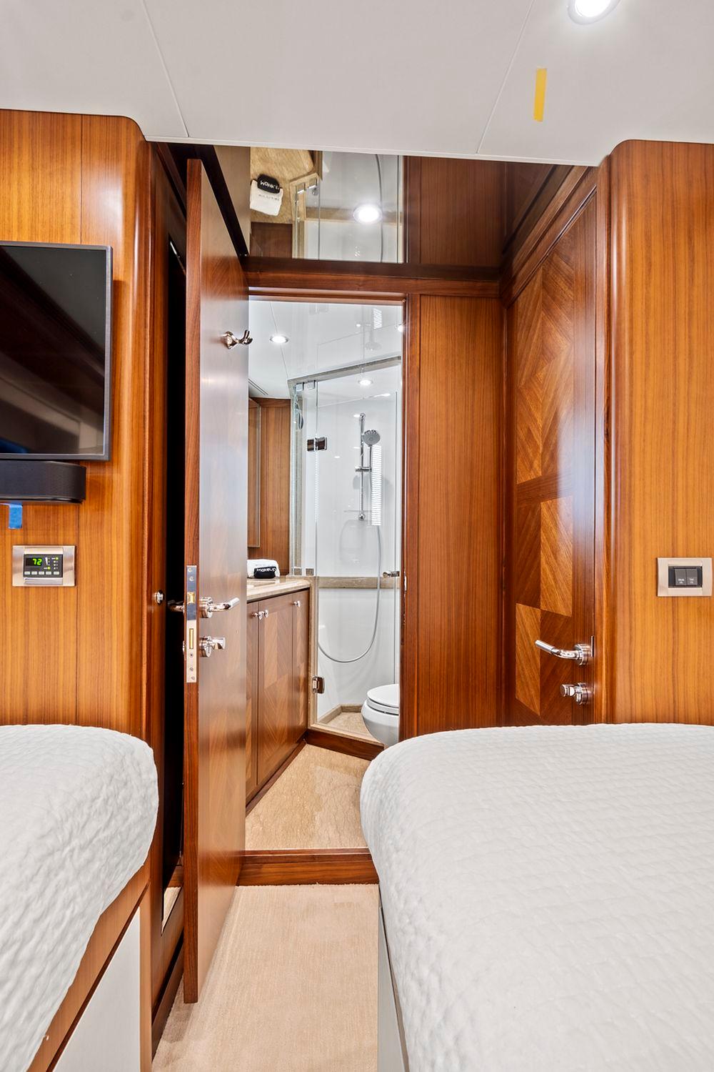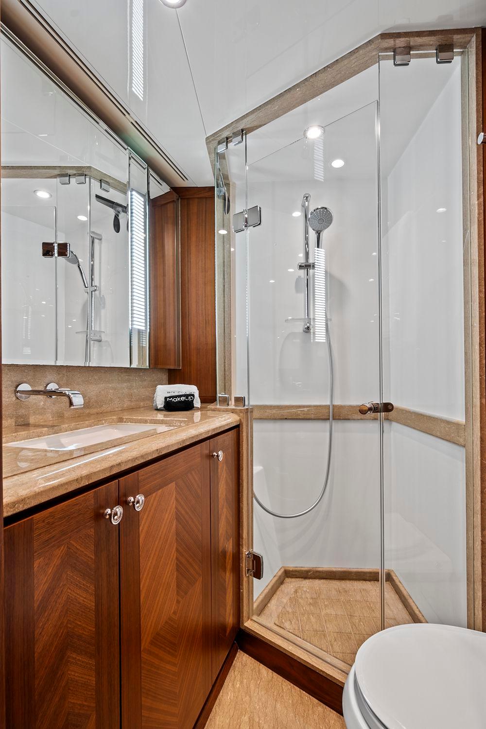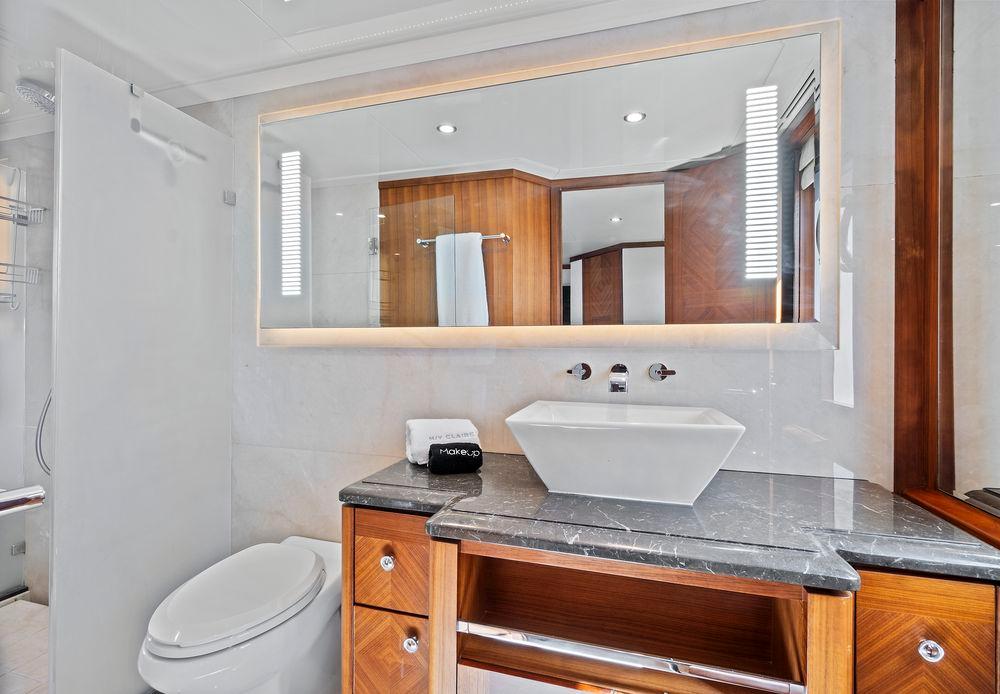 Number two on the “Wow Factor” is the Master Stateroom. Welcome to pure luxury and comfort. Upon entering you will notice large vertical windows that are on the port and starboard side, these allow the natural light to pour in like the above salon windows. Center of the room is a massive king size bed that is very inviting. The entire living area offers a his and her living space with twin walk-in cedar lined closets, make-up desk with storage to the starboard side, and multi-drawer dresser to the port side for great storage. Keeping with the his and her living space, there is a full beam master bathroom with twin sinks and heads on each side that meet in the middle with an oversized glass incased shower. This master stateroom like the rest of the vessel has been addressed during the refit and is sure to impress.